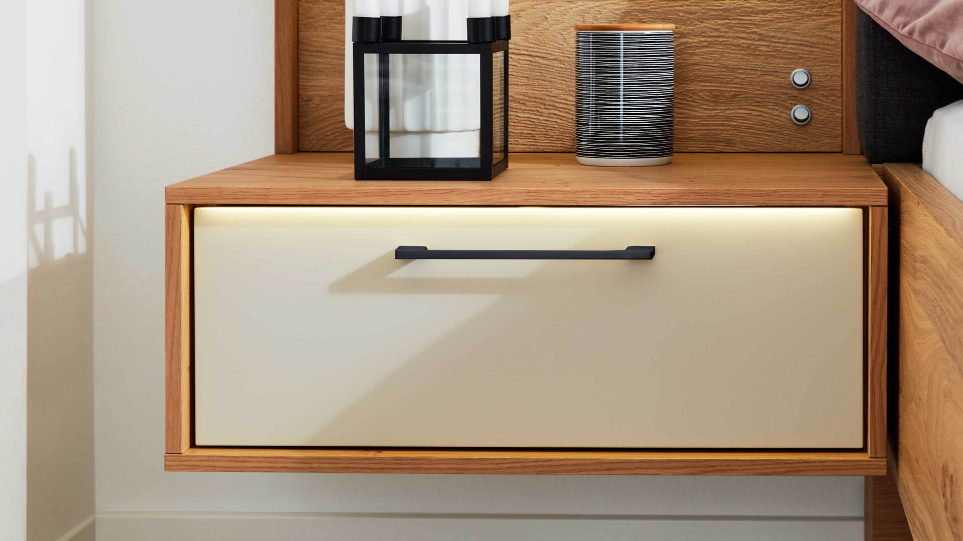 Die Vorderkantenbeleuchtung 80073 mit fest verbauten LED-Leuchtmitteln ist ein dekoratives Zubehör für die ca. 64 cm breiten Nachtkonsolen aus der Interliving Schlafzimmer Serie 1023.