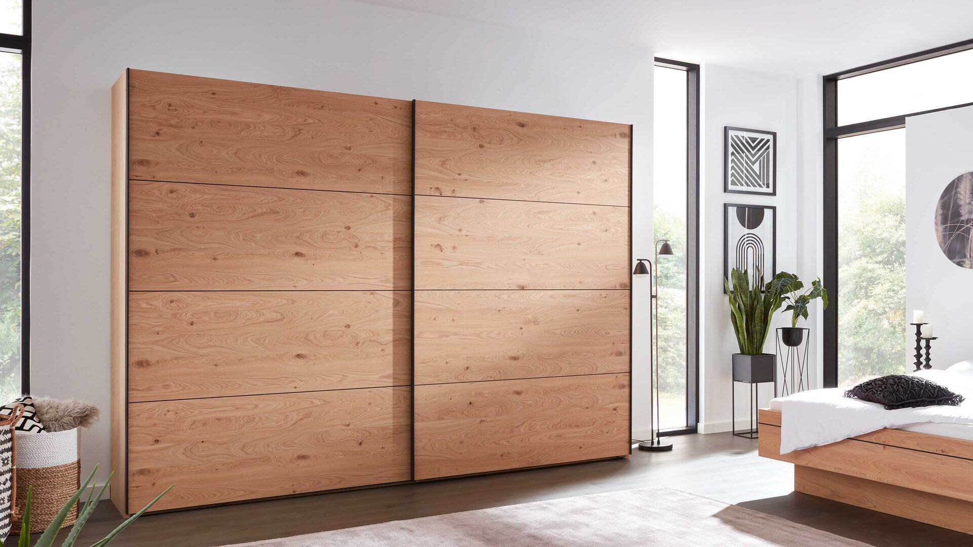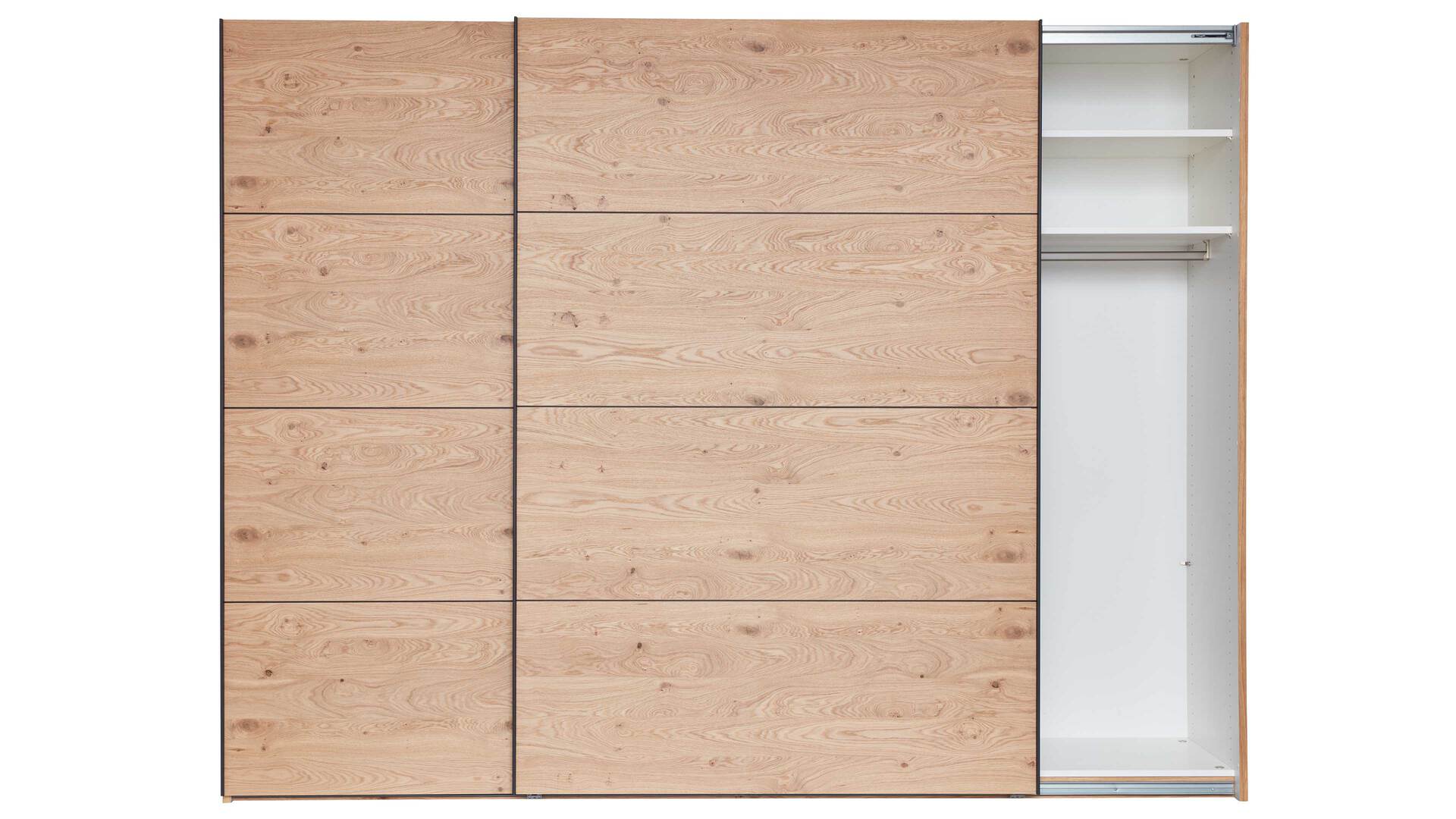 Der Schwebetürenschrank 983300 aus der Interliving Schlafzimmer Serie 1024 ist in Echtholz-Balkeneichefurnier gestaltet.