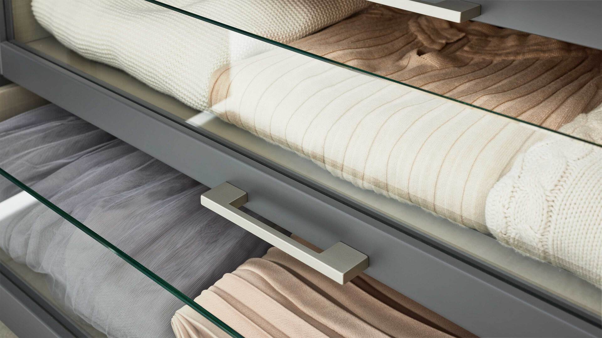 Das Set umfasst drei Schubladen mit edlen Glaseinsätzen. Zudem ist ein Abdeckboden im Lieferumfang enthalten. Die kombinierten Maße der Kleiderschrankschubladen belaufen sich auf ca. 97 x 46 x 56 cm (BxHxT).