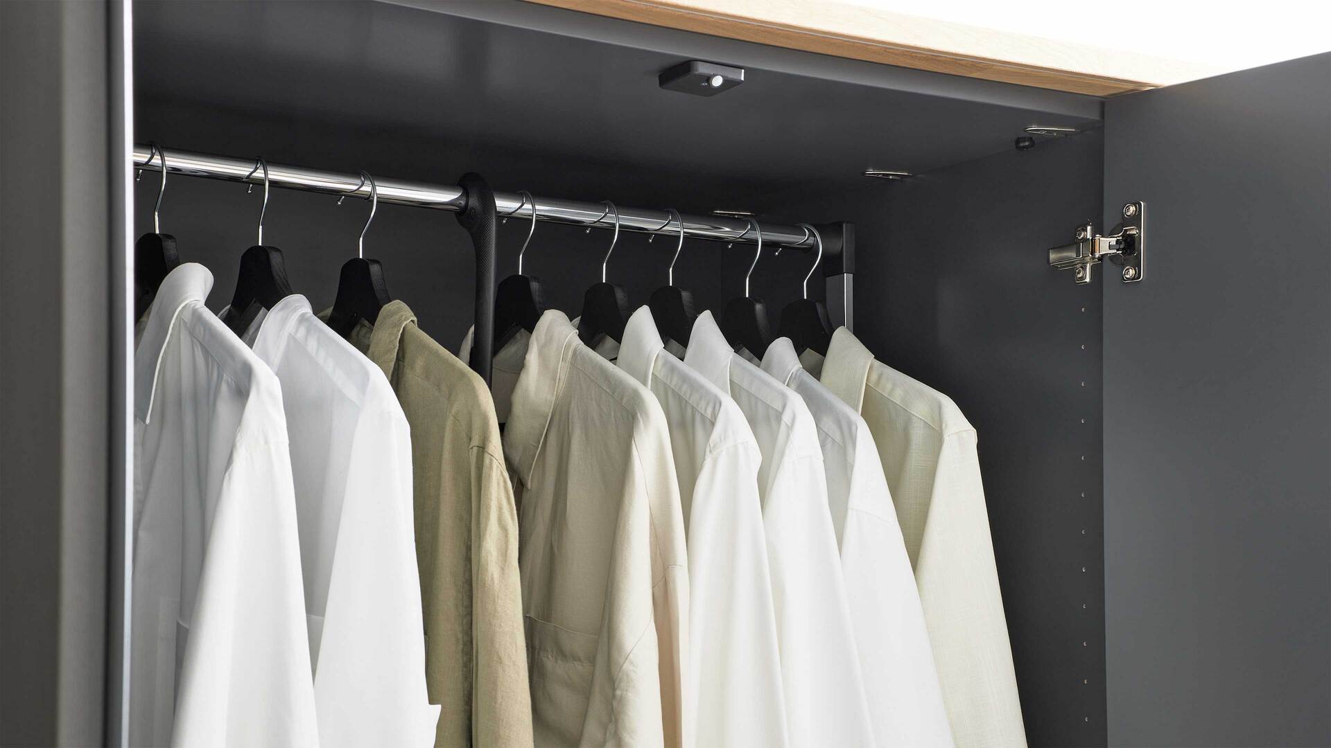 Der Kleiderlift 528911 aus der Interliving Schlafzimmer Serie 1029 ist eine Ergänzung für zweitürige Schrankelemente desselben Programms.