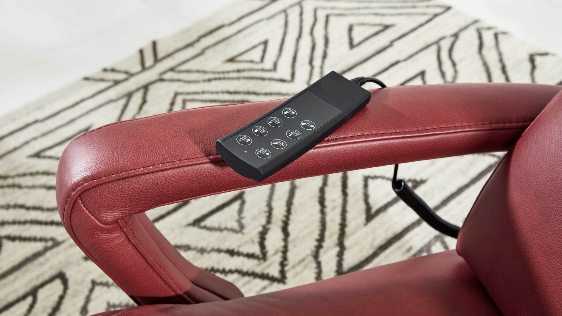 Der Relaxsessel F mit zwei Motoren aus der Interliving Sessel Serie 4541 kombiniert einen barolofarbenen LongLife-Lederbezug mit veredelter Oberfläche mit dem mattschwarz pulverbeschichteten Metall-Sternfuß V4S zu einem trendigen Entspannungsmöbel. Alternativ stehen Ihnen noch sechs weitere Fußvarianten zur Wahl. Die Materialien und Farben forcieren eine besonders stilvoll-elegante Ausstrahlung.