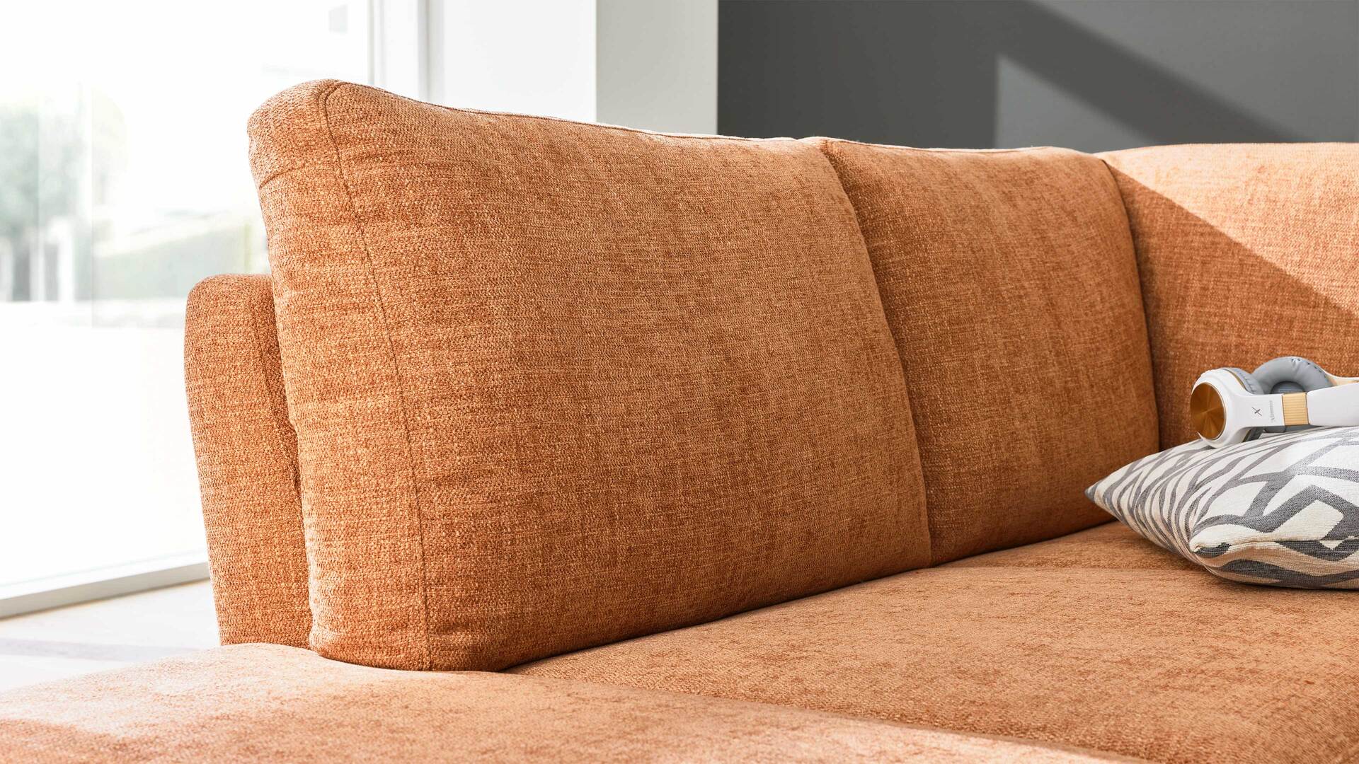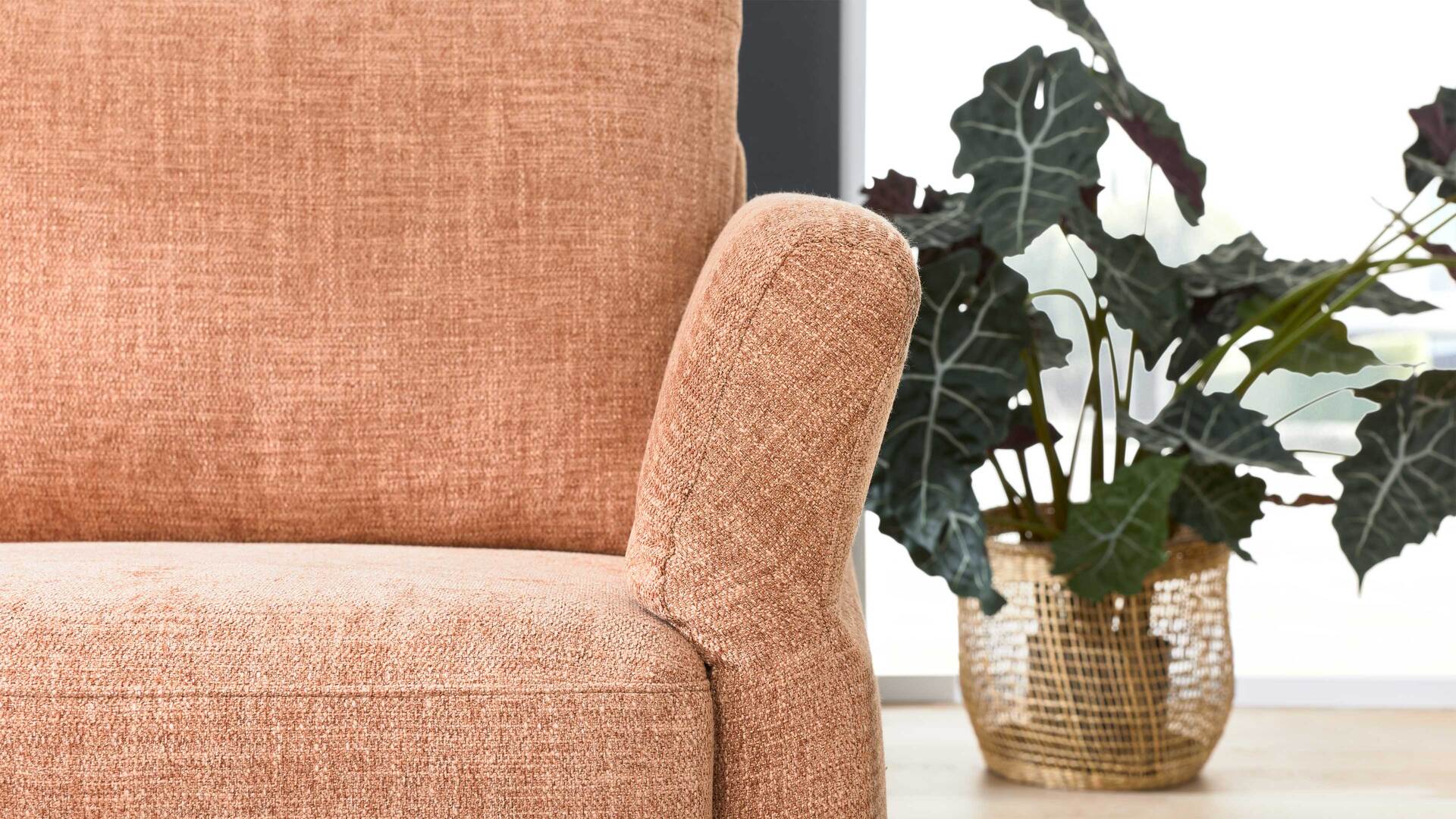 Neben Stoffen wie dem puderfarbenen Flachgewebe-Chenille sind zahlreiche weitere Bezüge in Leder oder Strukturgewebe erhältlich – auf Wunsch auch mit Kontrastfaden. Für noch mehr Komfort lässt sich das Sofa optional mit einer Steckkopfstütze inklusive Rastergelenk (gegen Mehrpreis) ausstatten – ideal für längeres Sitzen und zusätzlichen Halt im Nackenbereich.