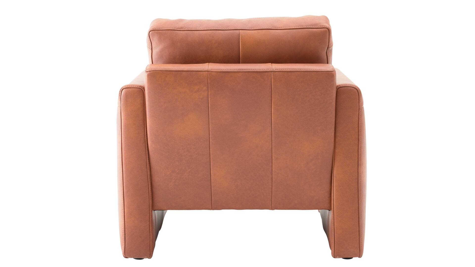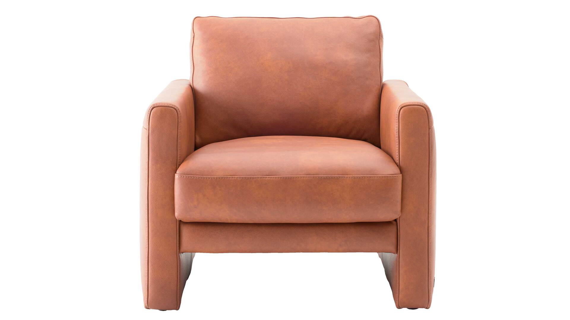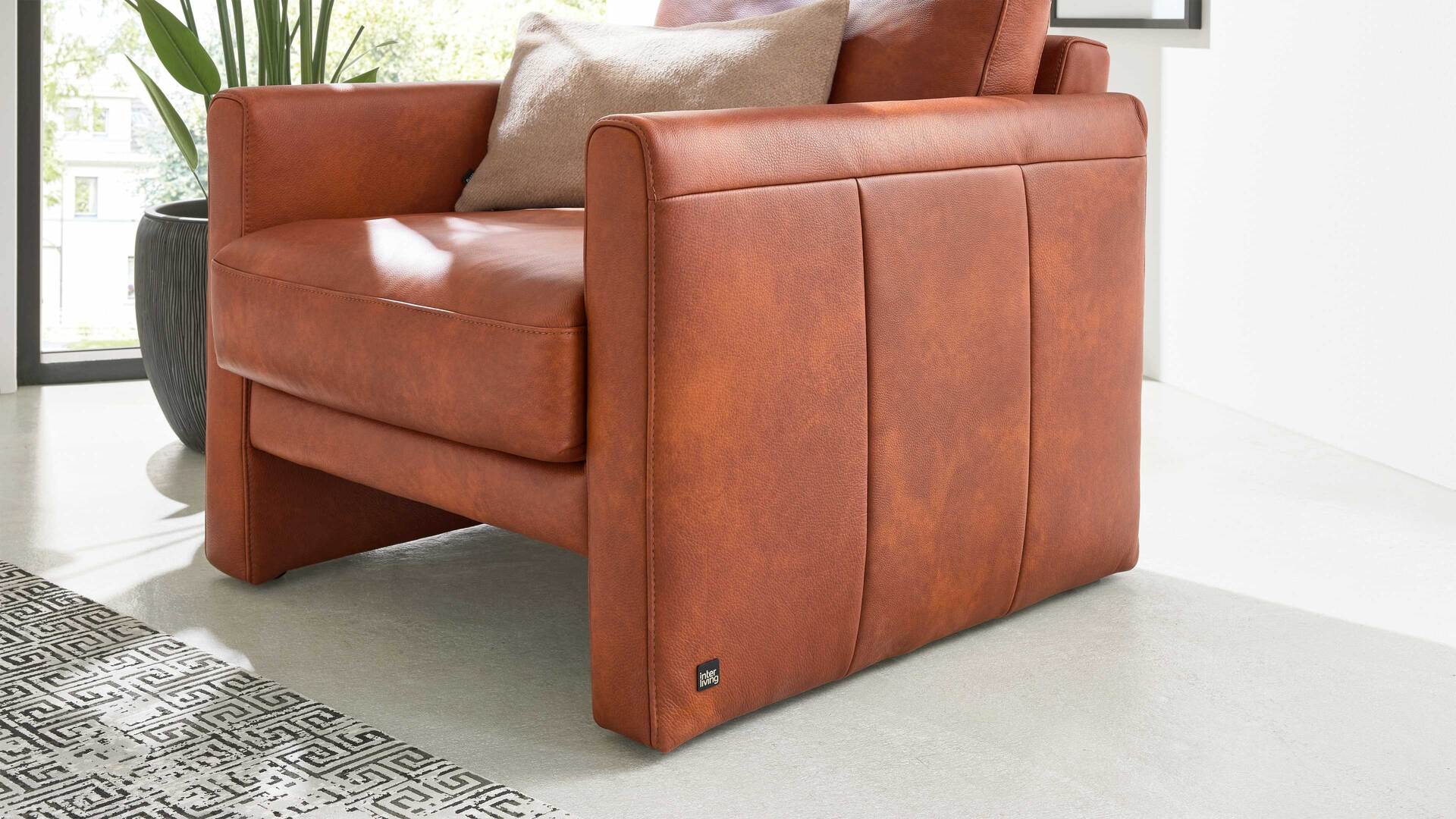Dank seines edlen cognacfarbenen LongLife-Lederbezugs strahlt der Sessel Wärme und Stilbewusstsein aus. Die kubischen, schmalen Armlehnen SB setzen moderne Akzente, während dezente schwarze Kunststoffgleiter (F85) die Gestaltung funktional und unaufdringlich abrunden. Ein harmonisches Designstatement für jedes Ambiente.