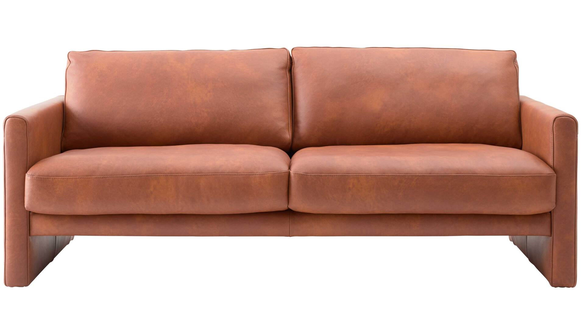 Der Bezug aus cognacfarbenem LongLife-Leder sorgt für eine wohnliche, edle Ausstrahlung. Die kubischen, schmalen Armlehnen SB unterstreichen die moderne Formsprache, während schwarze Kunststoffgleiter (F85) dezent in das Design eingebettet sind – funktional, stilvoll und zurückhaltend.