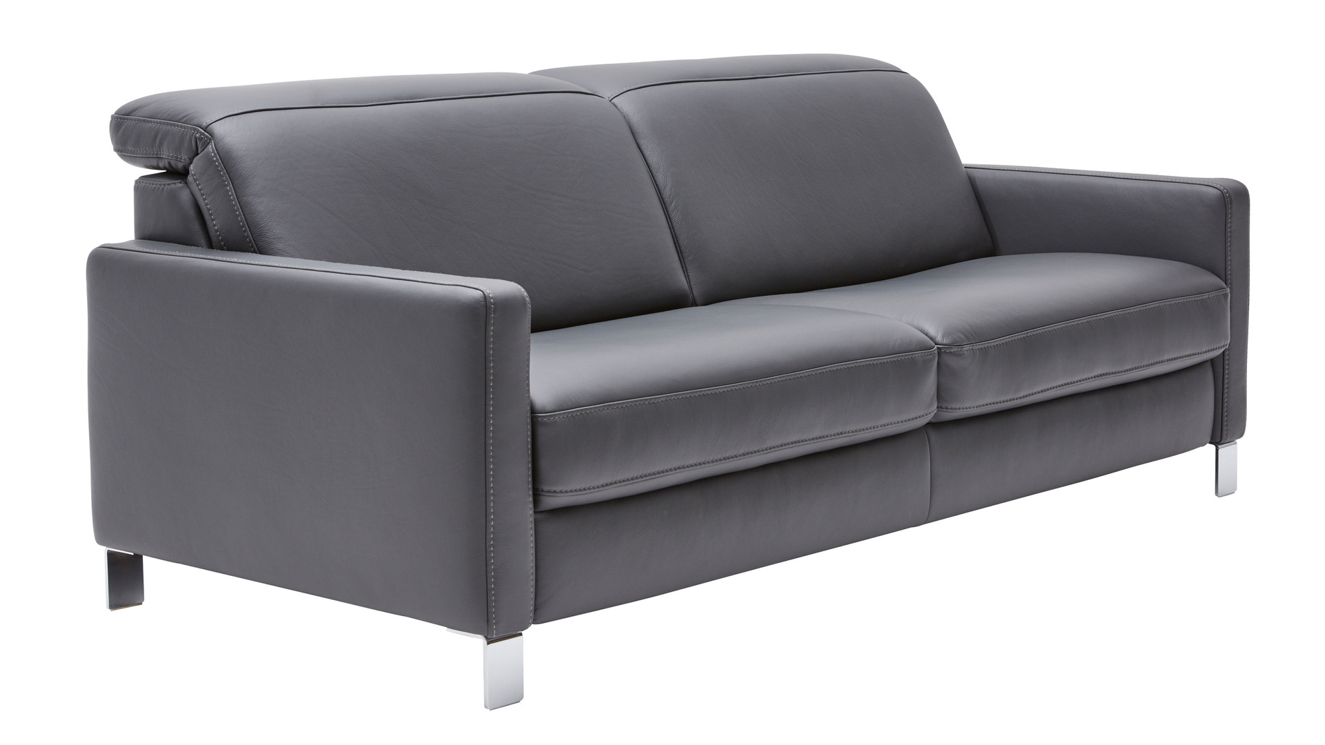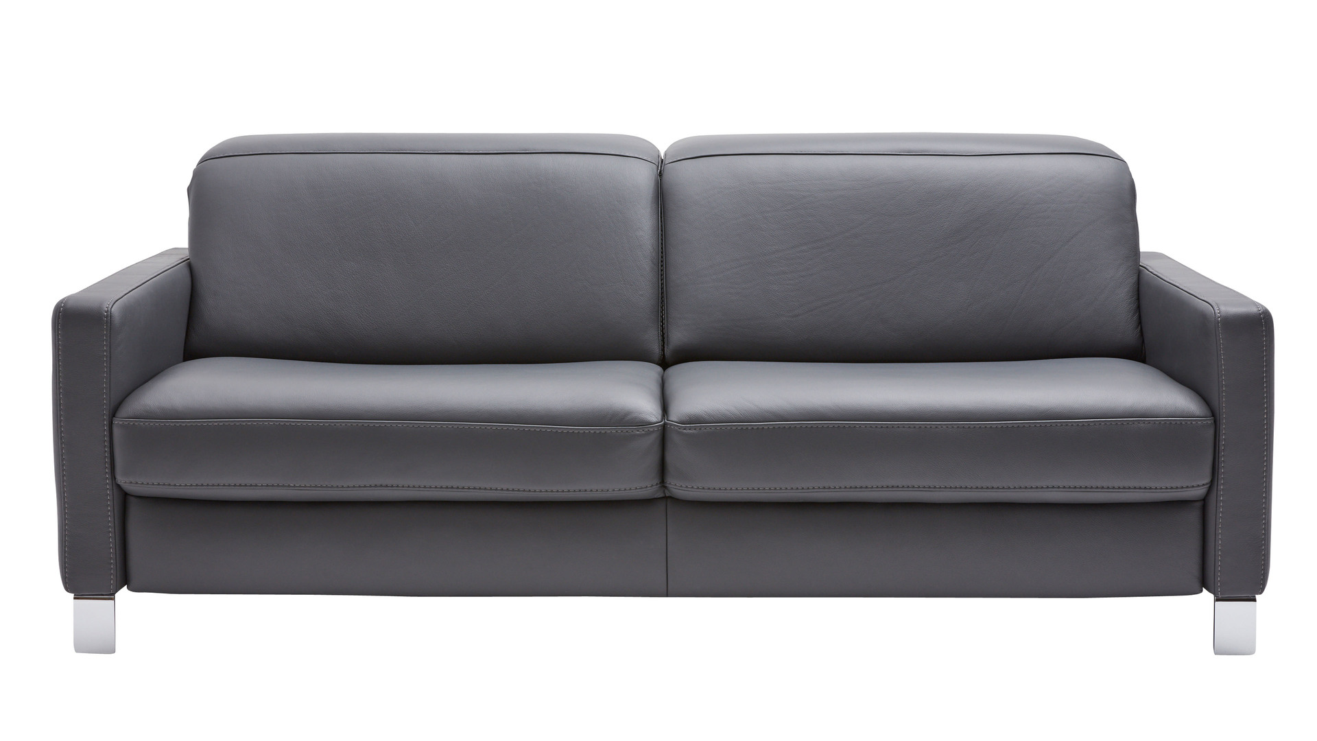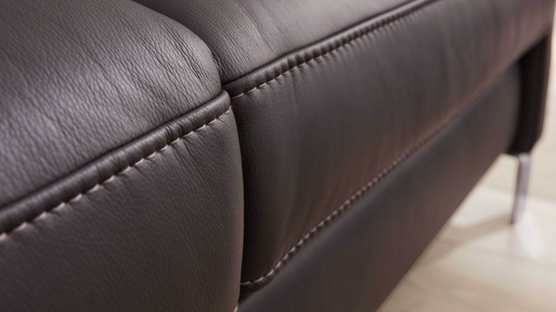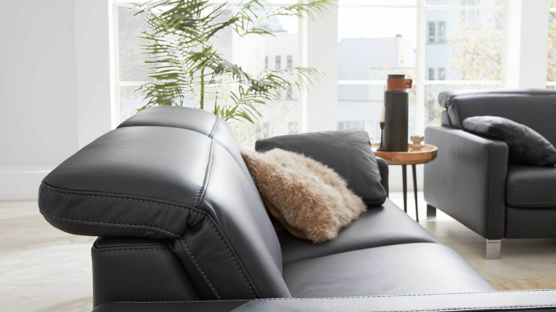 Er kombiniert einen anthrazitfarbenen LongLife-Lederbezug naturblelassnem Narbenbild, voluminösem und zugleich softem Griff mit besonders schmalen, stabilen Chrom-Metallfüßen. Alternativ sind sieben weitere Fußvarianten lieferbar. Die Ton-in-Ton-Kappnähte fügen sich harmonisch ins Gesamtbild ein. Für einen stilvollen Akzent bestellen Sie einfach die Version mit auffälliger Kontrastnaht.
