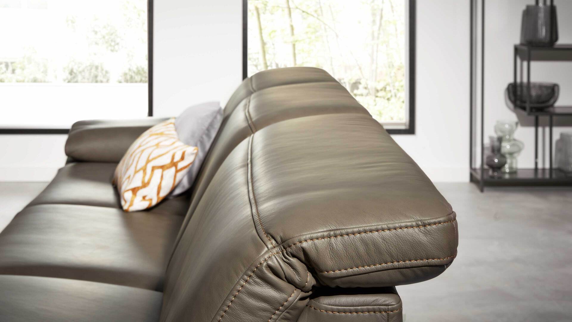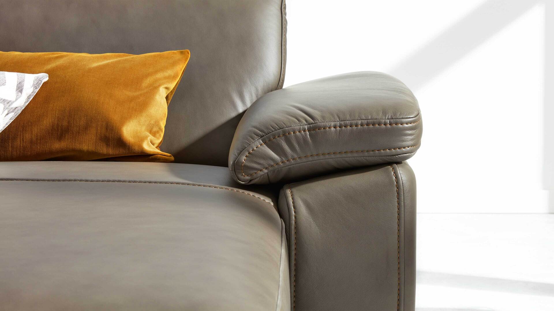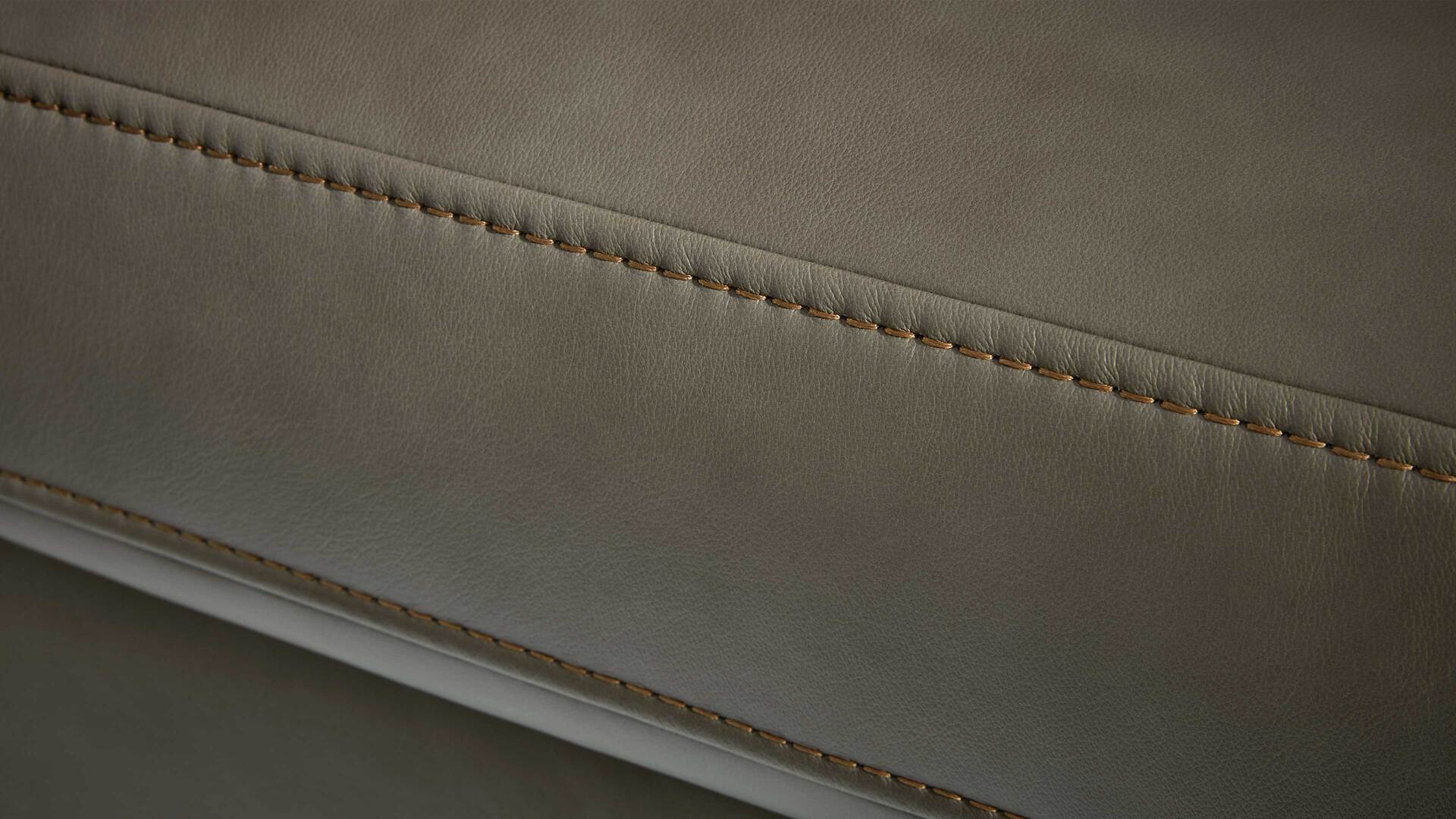 Es kombiniert einen steingrauer LongLife-Lederbezug mit klassisch-schwarzen Metall-Profilfüßen. Alternativ sind sieben weitere Fußvarianten lieferbar. Die Ton-in-Ton-Kappnähte fügen sich harmonisch ins Gesamtbild ein. Für einen stilvollen Akzent bestellen Sie einfach die Version mit auffälliger Kontrastnaht.