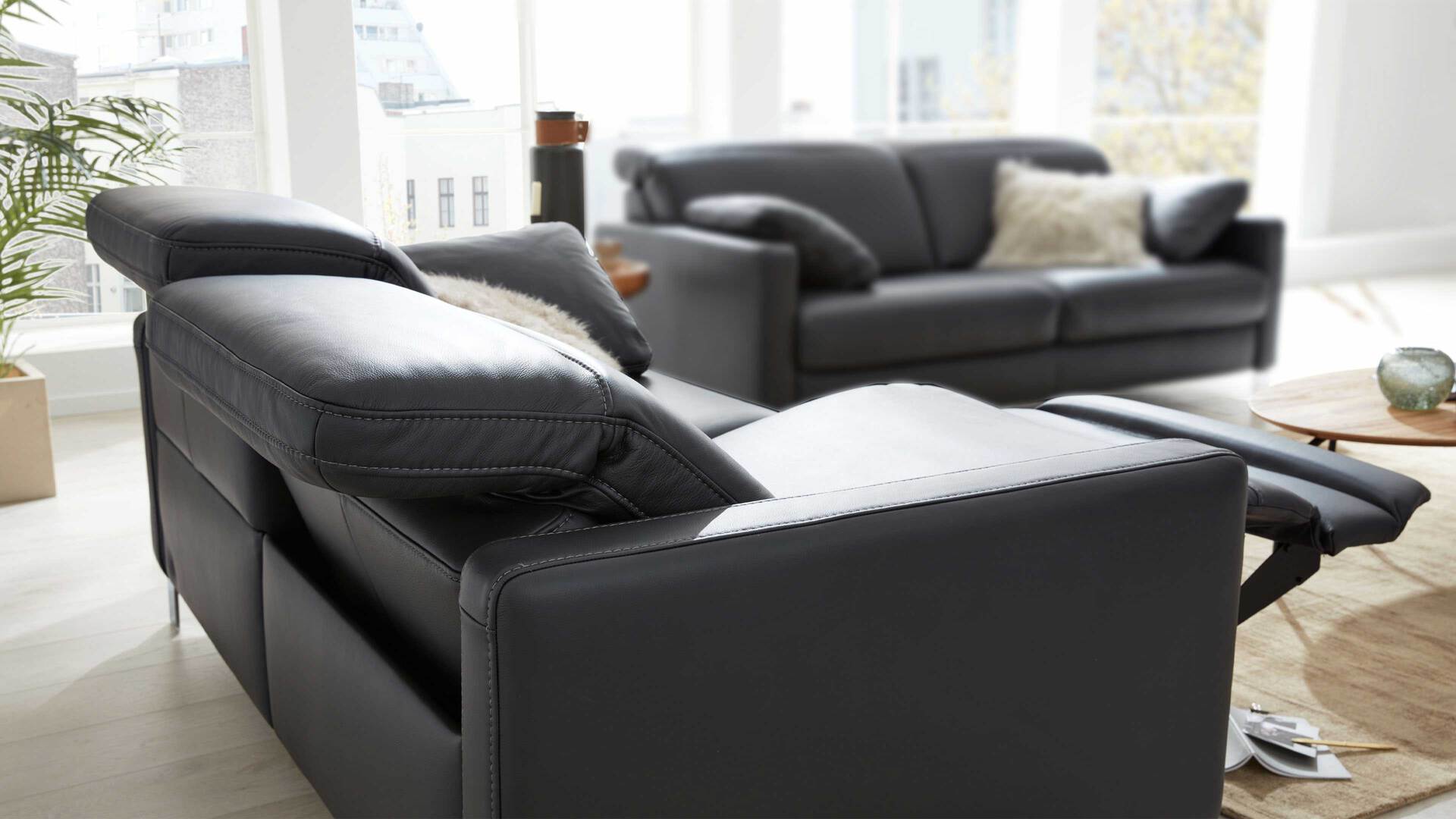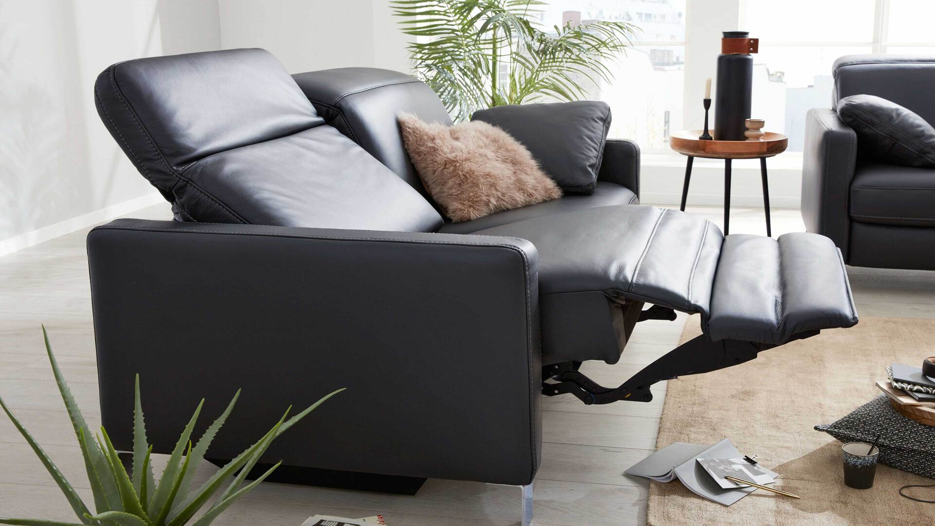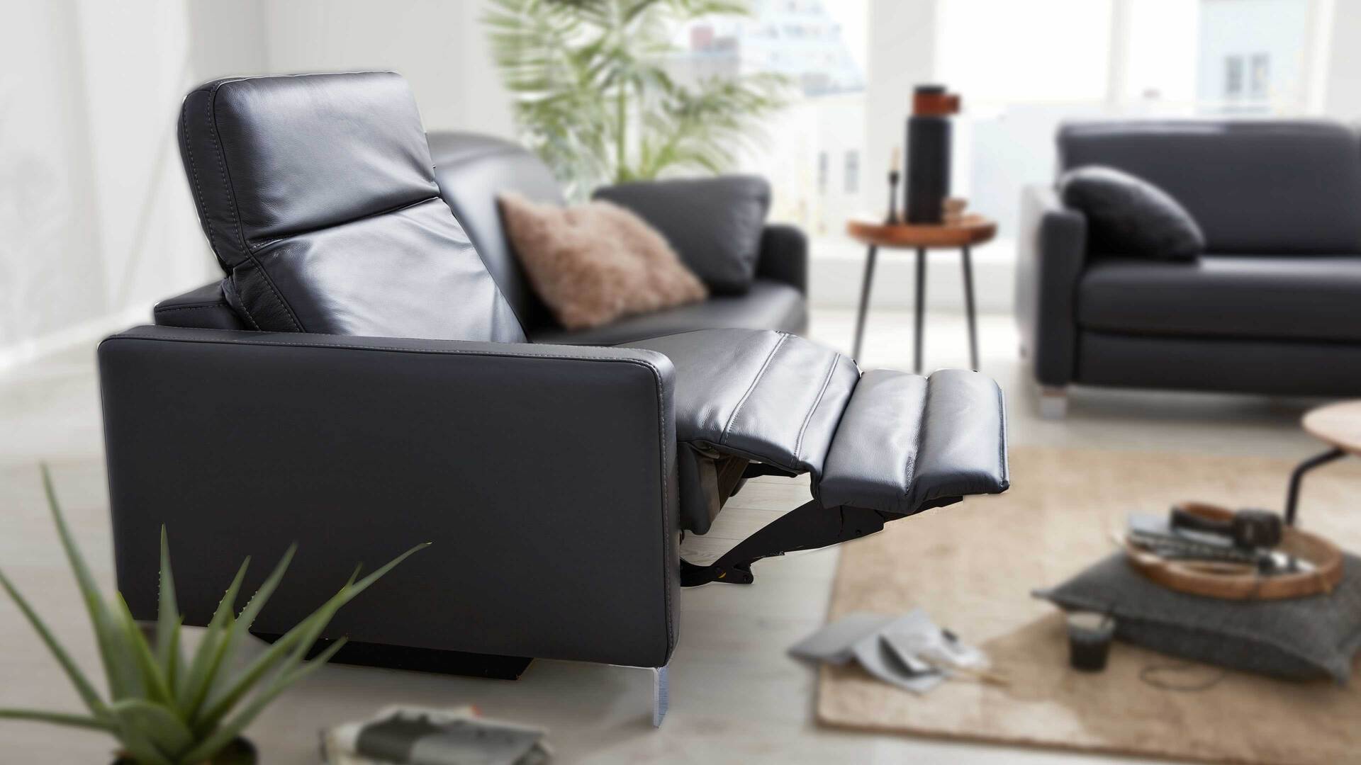 Die motorisierte Relaxfunktion WA1 wird komfortabel über seitlich integrierte Touch-Buttons bedient. Dabei fährt zunächst die Beinauflage auf Sitzhöhe aus, während sich der Sitz leicht nach vorn und nach oben bewegt – in eine angenehme Relaxposition. Der Clou: Der Rücken bleibt dabei wandfrei, sodass Sie das Sofa auch direkt an der Wand aufstellen können.