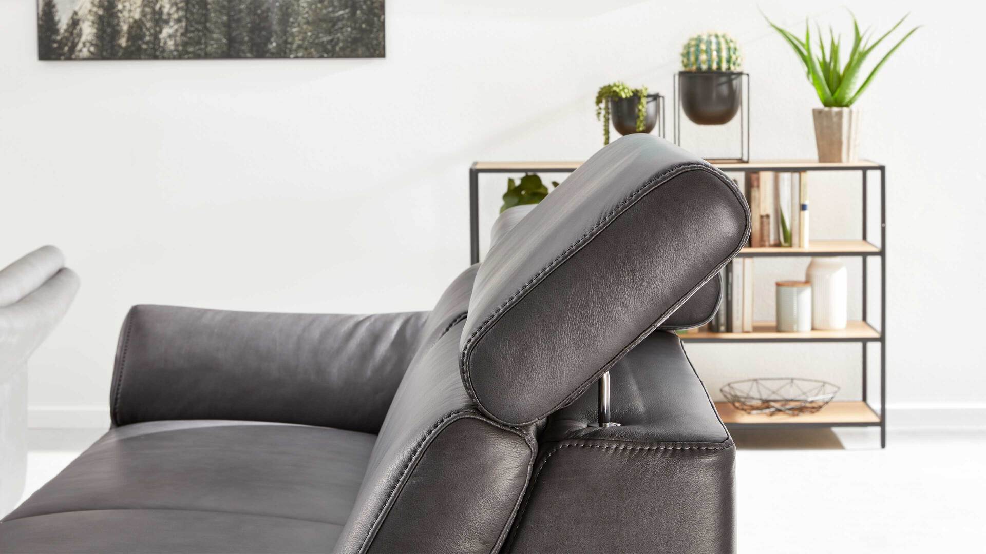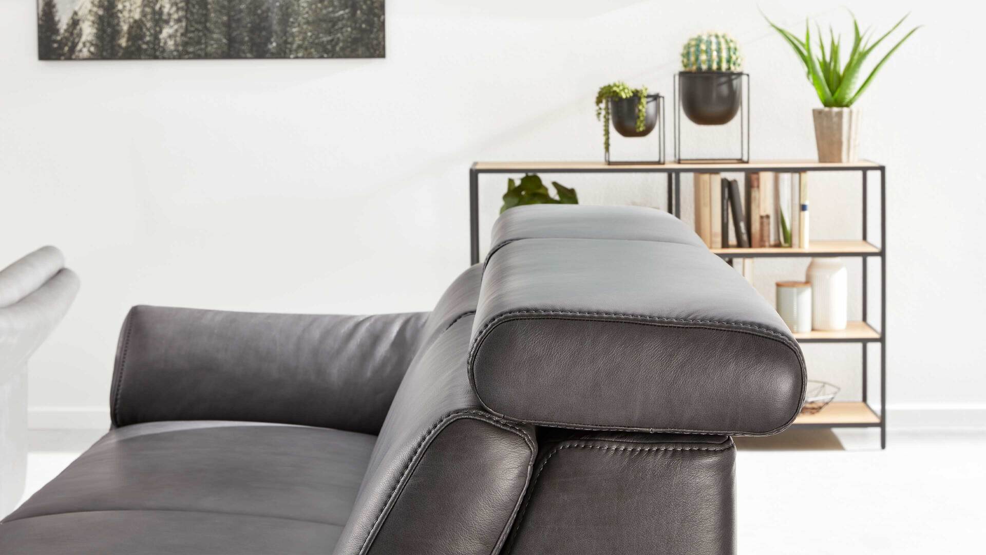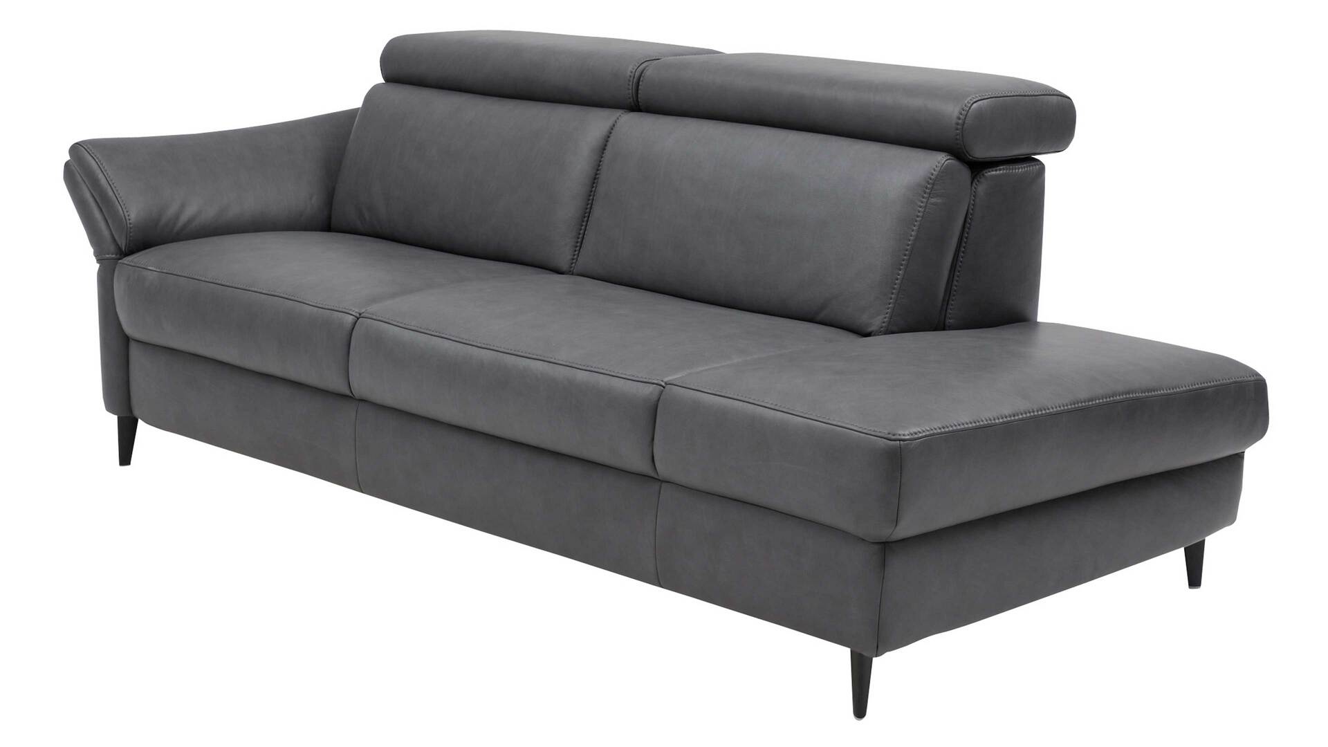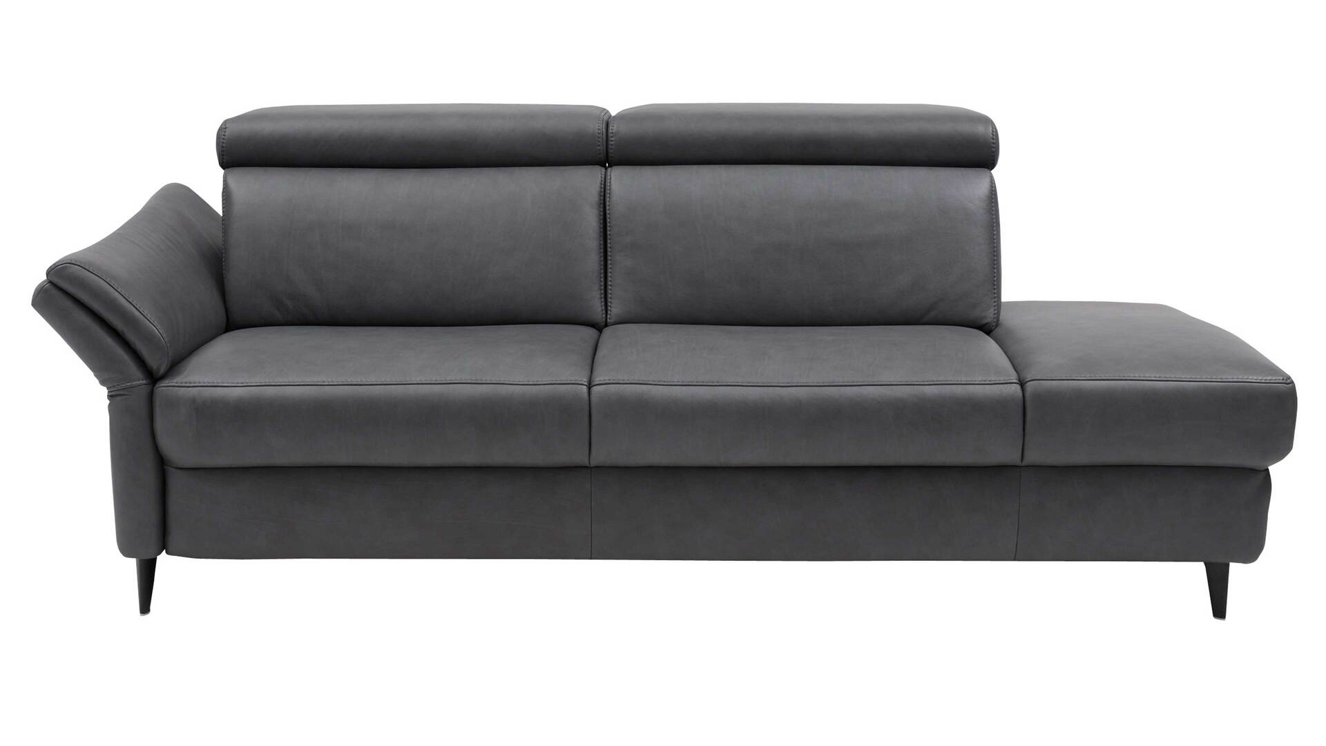 Die Récamiere 2,5RECRKV aus der Interliving Sofa Serie 4055 verbindet stilvolle Ästhetik mit einem hohen Maß an Komfort. Der edle anthrazitfarbene LongLife-Lederbezug mit pigmentierter Oberfläche und softigem Griff verleiht dem Möbelstück eine moderne, zugleich wohnlich-warme Ausstrahlung. Die puristisch-schwarzen Aluminiumfüße unterstreichen den klaren Look.