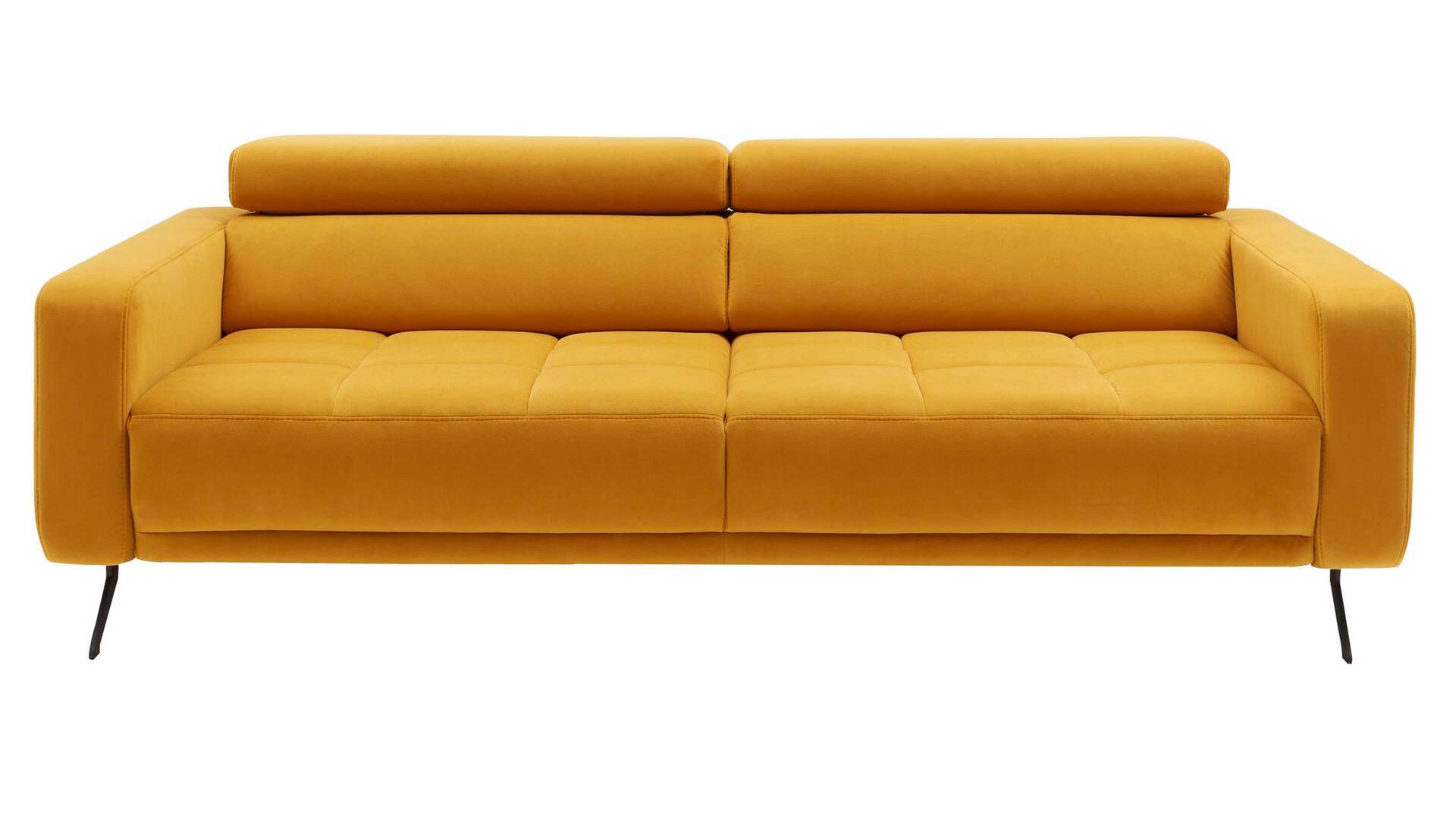 Der 2,5-Sitzer aus der Interliving Sofa Serie 4303 vereint modernes Design mit durchdachtem Sitzkomfort. Mit ca. 190 x 74–94 x 116 cm (B/LxHxT) bietet dir dieses Sofa Platz für entspannte Stunden – ob allein, zu zweit oder mit der Familie. Der curryfarbene Stoffbezug in edler Samtoptik sorgt für eine warme Ausstrahlung, während die mattschwarzen Metallfüße das Möbelstück modern und leicht wirken lassen.