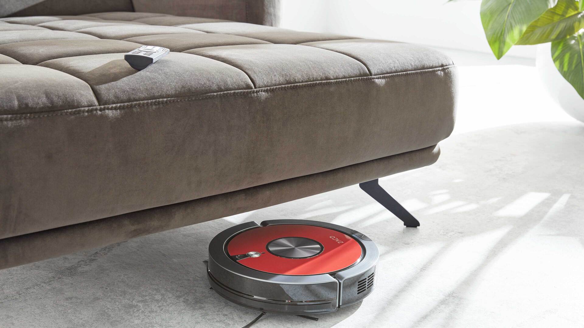 Dank erhöhter Bodenfreiheit wirkt die Sofalandschaft modern und luftig. Außerdem lässt sich der Bereich unter der Couch bequem reinigen – sogar mit einem Saugroboter.
