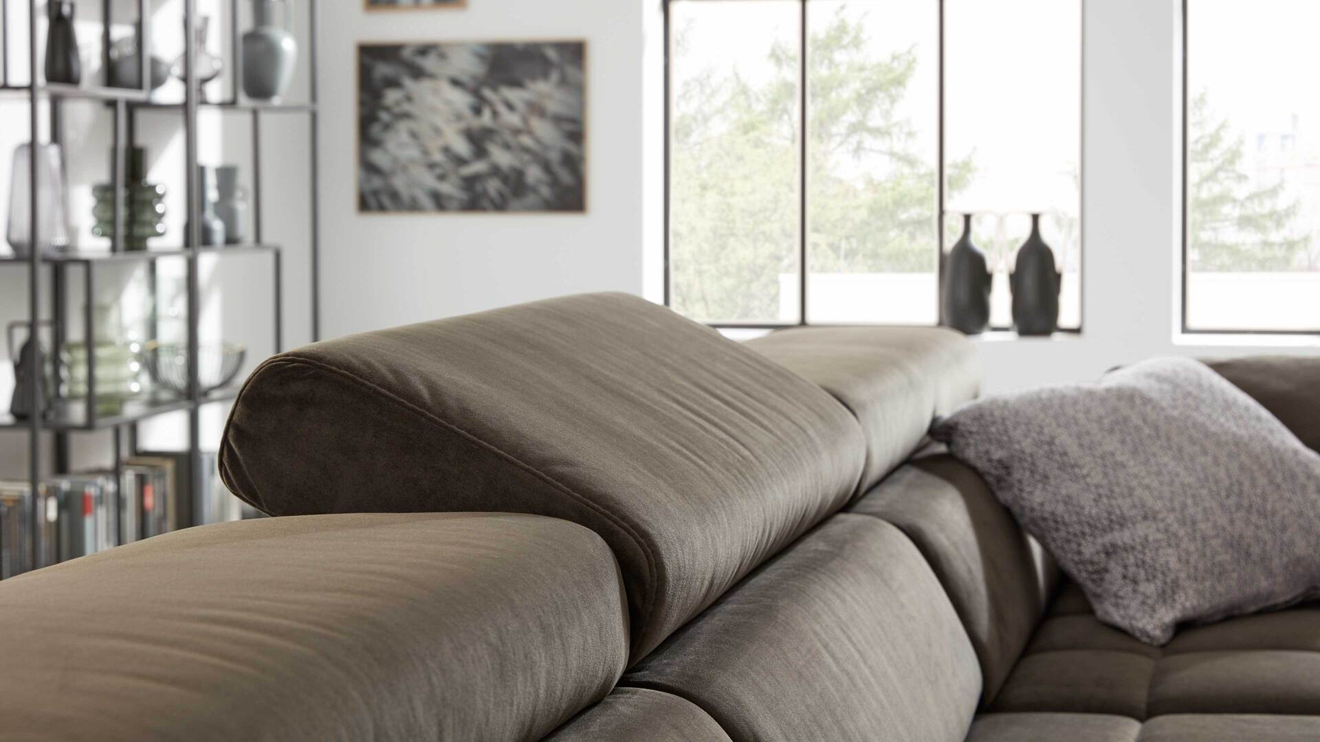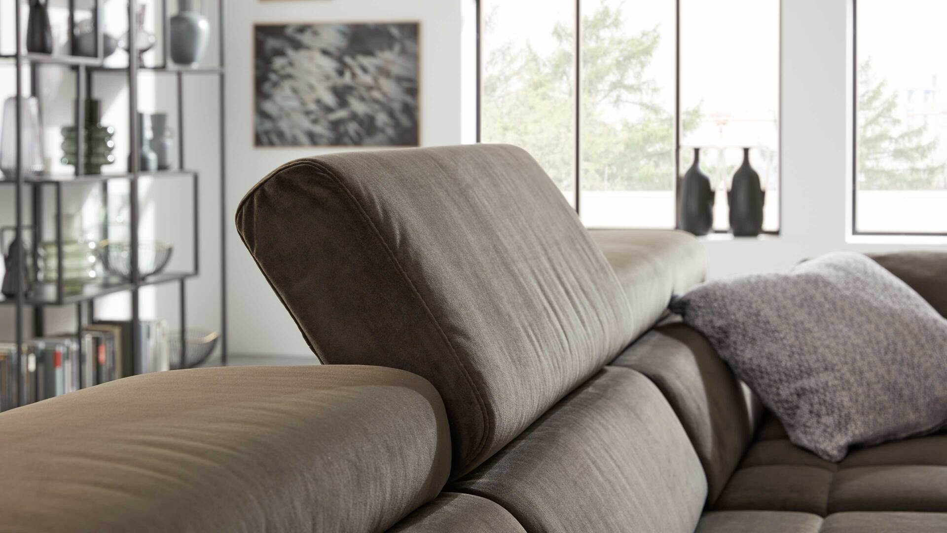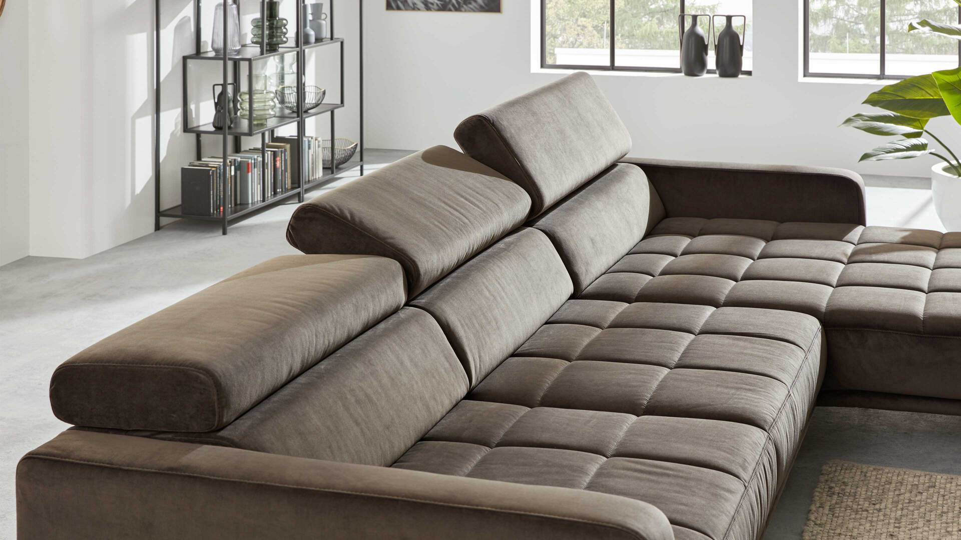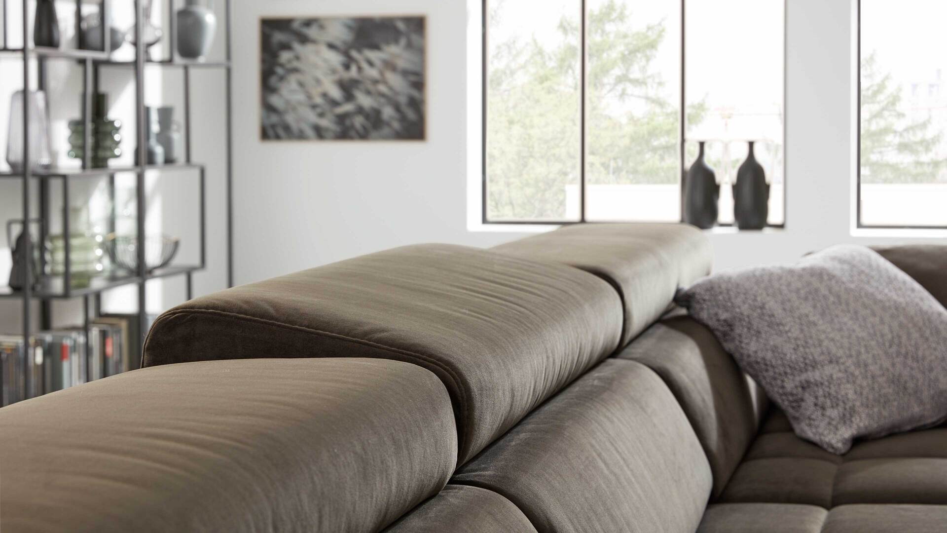 Das Ecksofa punktet mit einem hochwertigen Innenleben aus Kaltschaum, Polyätherschaum und langlebiger Wellenunterfederung. Die Rückenlehnen sind ebenfalls gepolstert und bieten stabilen Halt. Extra praktisch: die individuell verstellbaren Kopfstützen mit Rasterbeschlag – perfekt für deine persönliche Lieblingsposition.