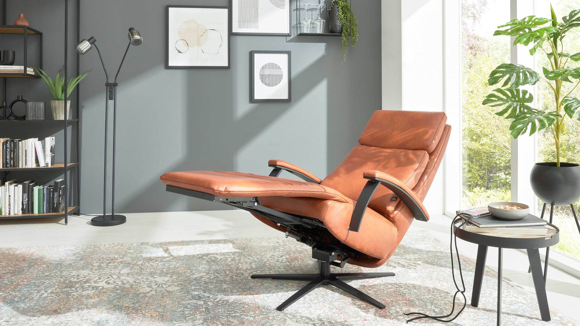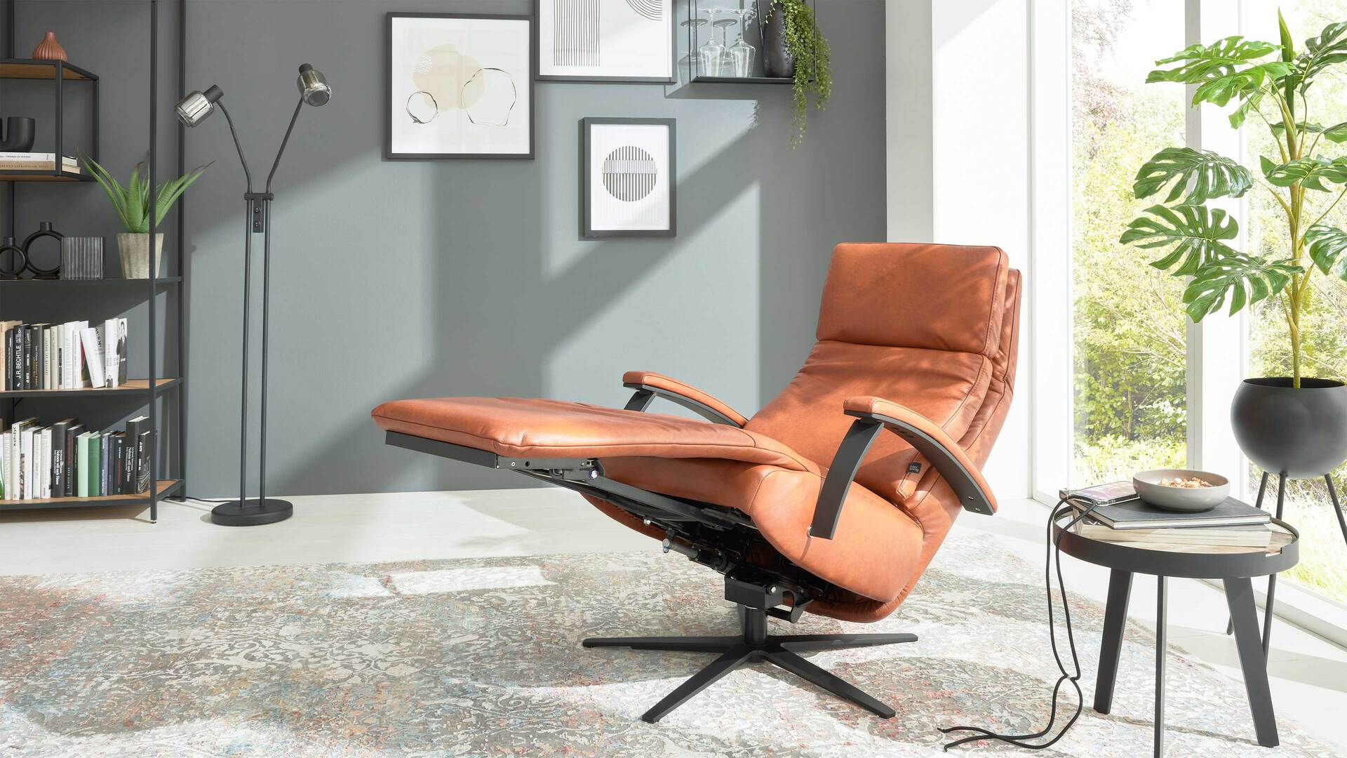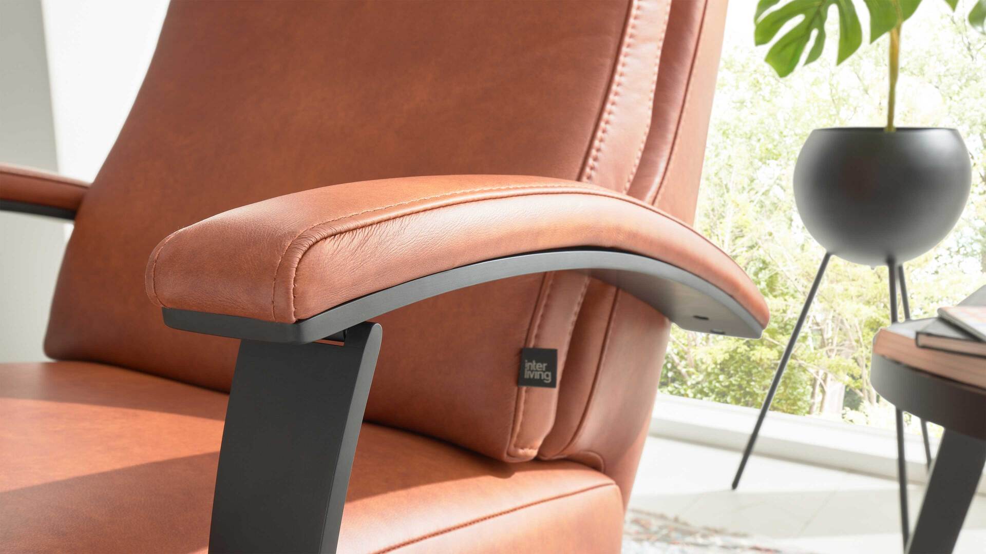 Der Relaxsessel C mit manueller Relaxfunktion aus der Interliving Sessel Serie 4541 kombiniert einen cognacfarbenen LongLife-Lederbezug mit feiner Lederstruktur in 2-Ton-Optik mit dem mattschwarzen Metall-Sternfuß V4S zu einem trendigen Entspannungsmöbel. Alternativ stehen Ihnen noch sechs weitere Fußvarianten zur Wahl. Die Materialien und Farben forcieren eine besonders stilvoll-elegante Ausstrahlung.