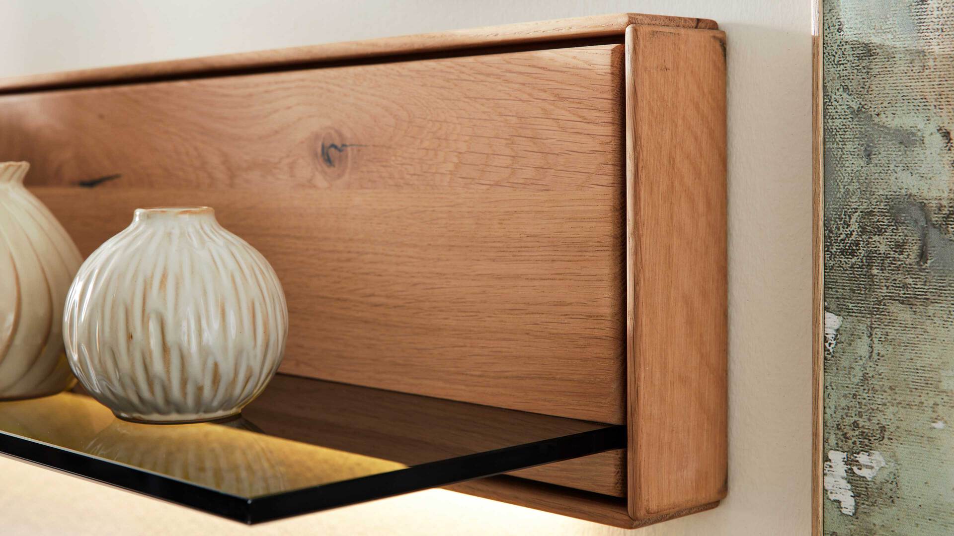 Das Wandboard 151852 aus der Interliving Wohnzimmer Serie 2020 kombiniert bianco geölte Asteiche mit einem integrierten Klarglasboden – für eine leichte, moderne Optik. Das Massivholz bringt Wärme und Eleganz in deinen Wohnraum, während das Glaselement Platz für dekorative Accessoires schafft und diese stilvoll in Szene setzt.