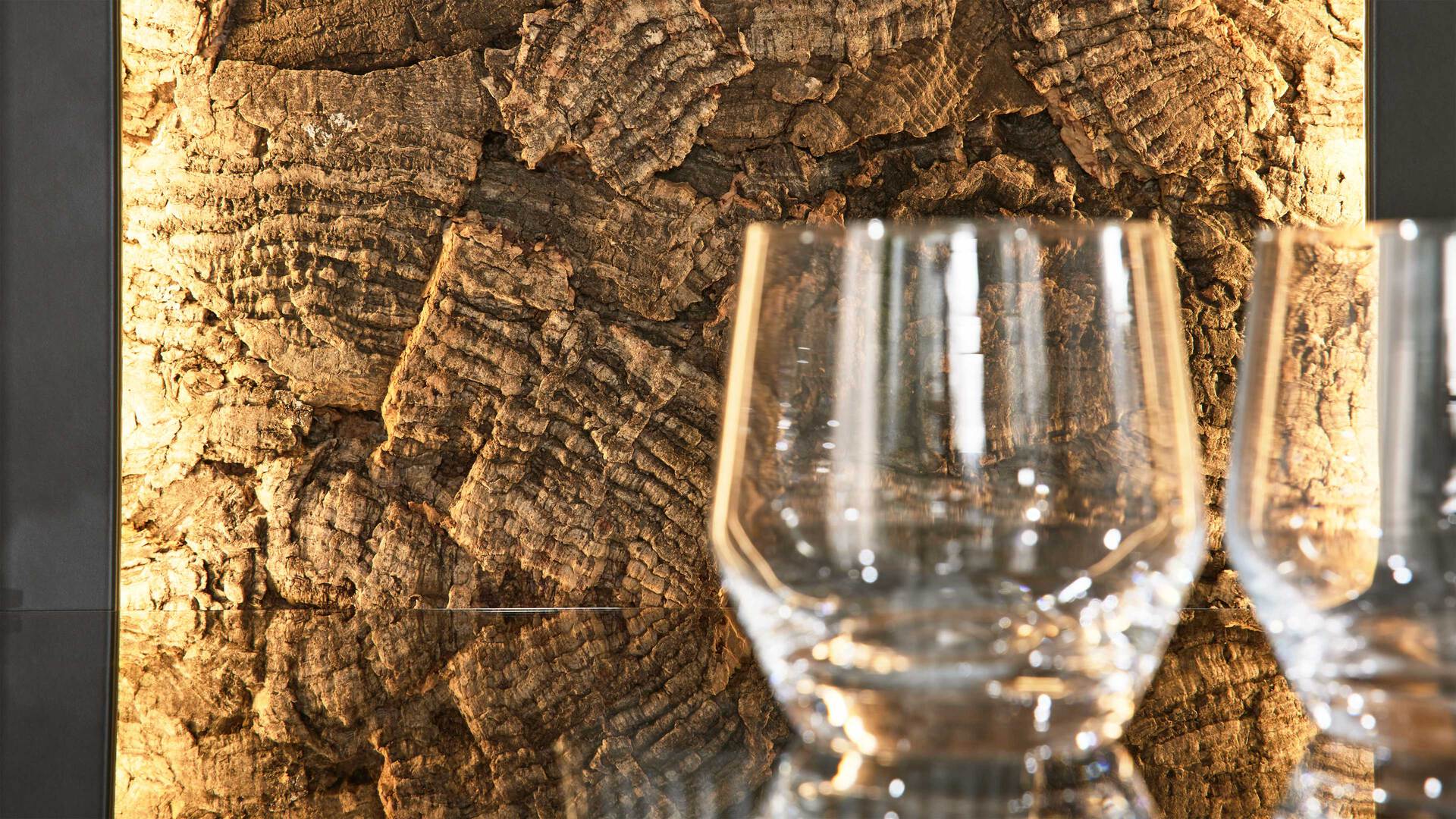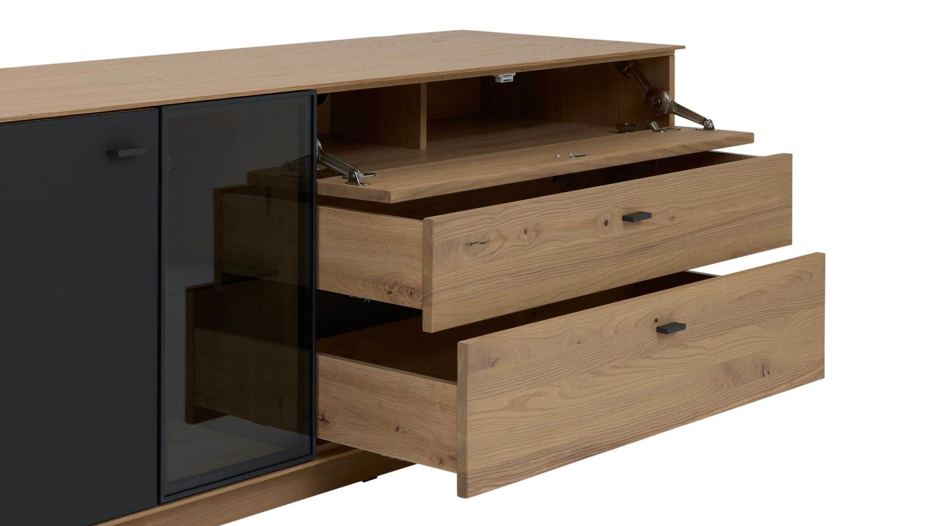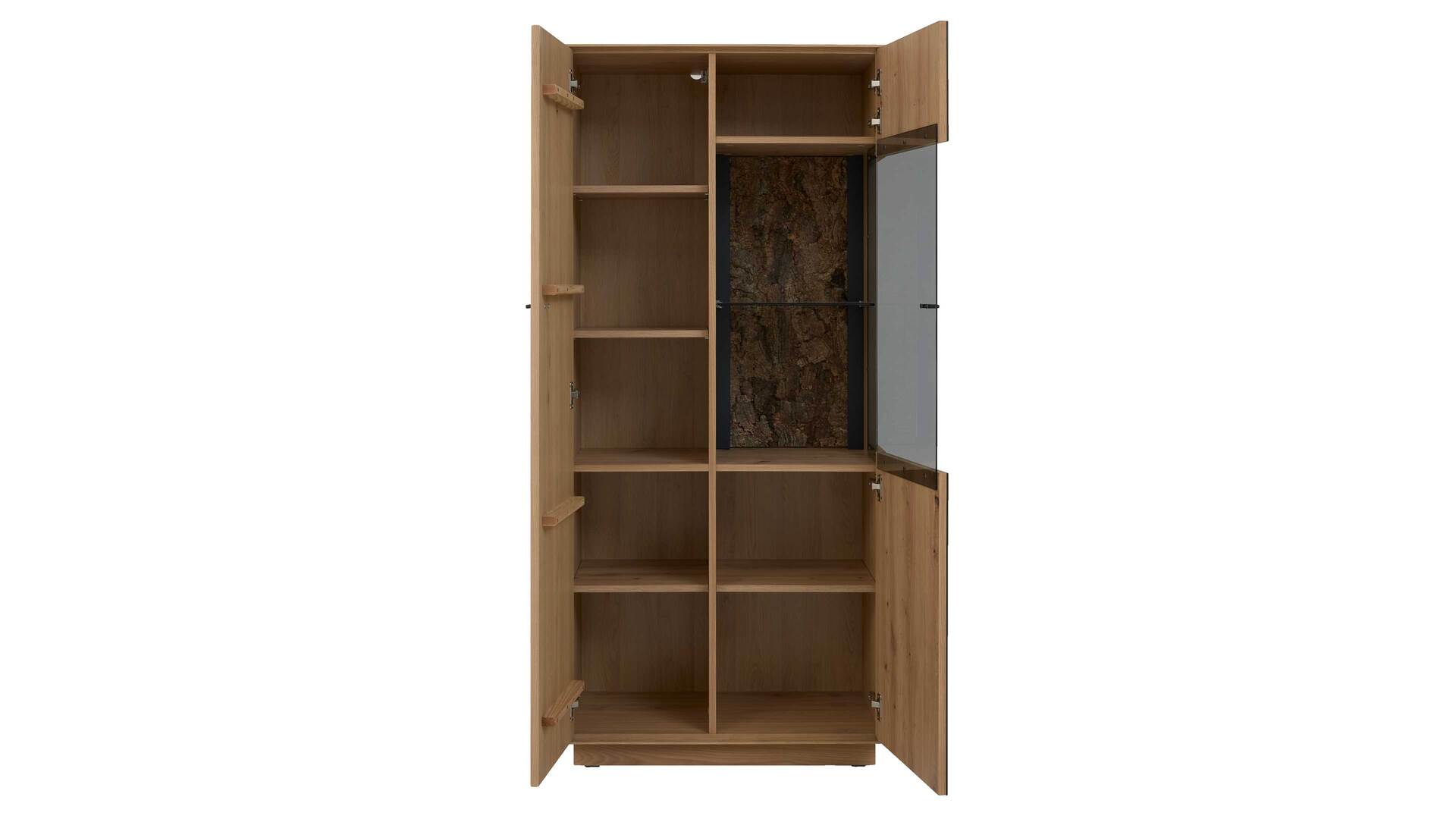 Die feine Kork-Rückwand und das satinmatte anthrazitfarbene Parsolglas setzen stilvolle Akzente und schaffen einen spannenden Kontrast zum natürlichen Holzbild. Die anthrazitfarben lackierten Metallgriffe mit Feinstruktur unterstreichen die moderne Optik und fügen sich dezent, aber wirkungsvoll in das Gesamtdesign ein.
