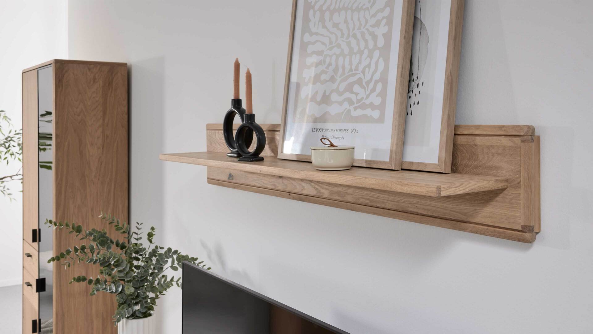 Das Anbau-Wandregal 8320 aus der Interliving Wohnzimmer Serie 2028 verbindet natürliche Materialien mit einem modernen, reduzierten Design. Gefertigt aus soft gebürsteter und geölter Wildeiche, bringt es warme Holzoptik in Ihre Wohnwand und überzeugt gleichzeitig durch eine besondere Formgebung: einseitig gerundet, lässt sich das Regal wahlweise rechts oder links montieren – für maximale Gestaltungsfreiheit.