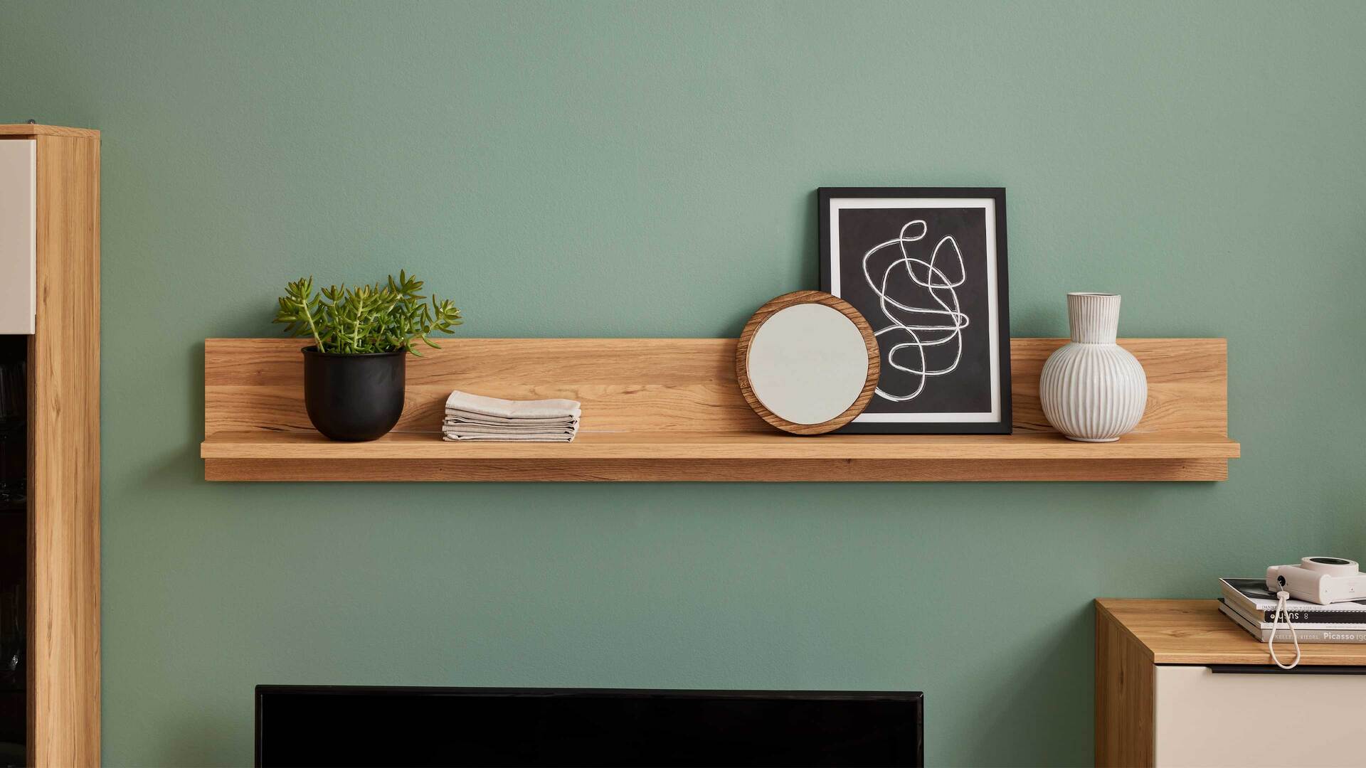 Mit Maßen von ca. 162 x 2,4 x 25 cm (Breite x Höhe x Tiefe) eignet sich das Wandregal perfekt als ergänzendes Element in einer Regalkombination oder als stilvolle Einzelkomponente für dekorative Objekte. Die klare Linienführung und das feine Profil schaffen eine moderne Leichtigkeit, die sich harmonisch in das Gesamtkonzept der Interliving Wohnzimmer Serie 2028 einfügt.