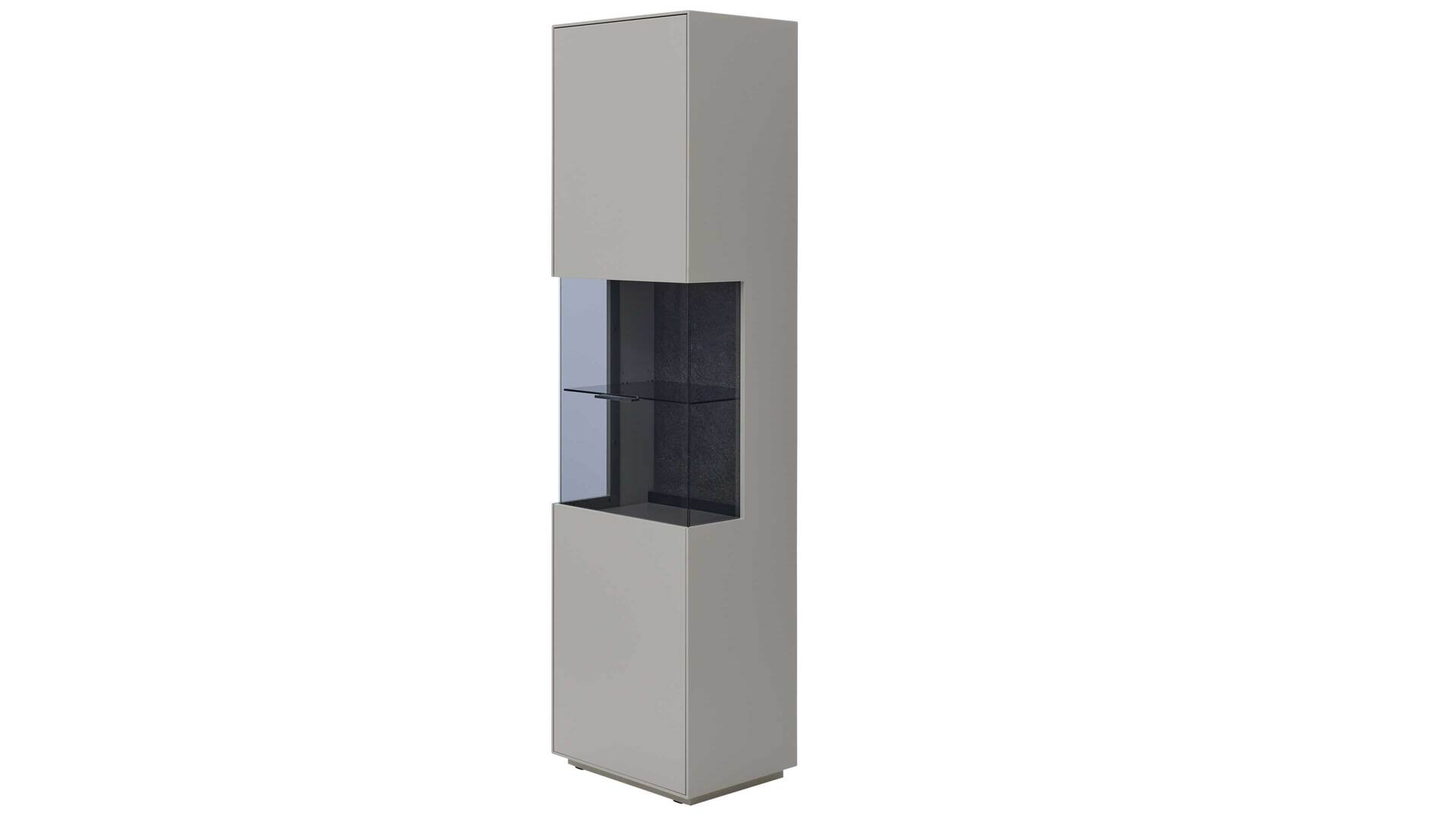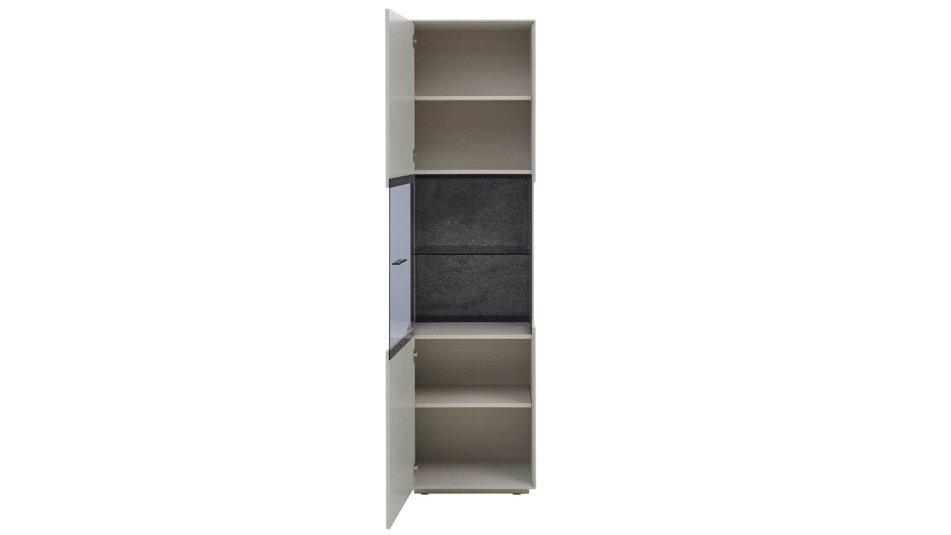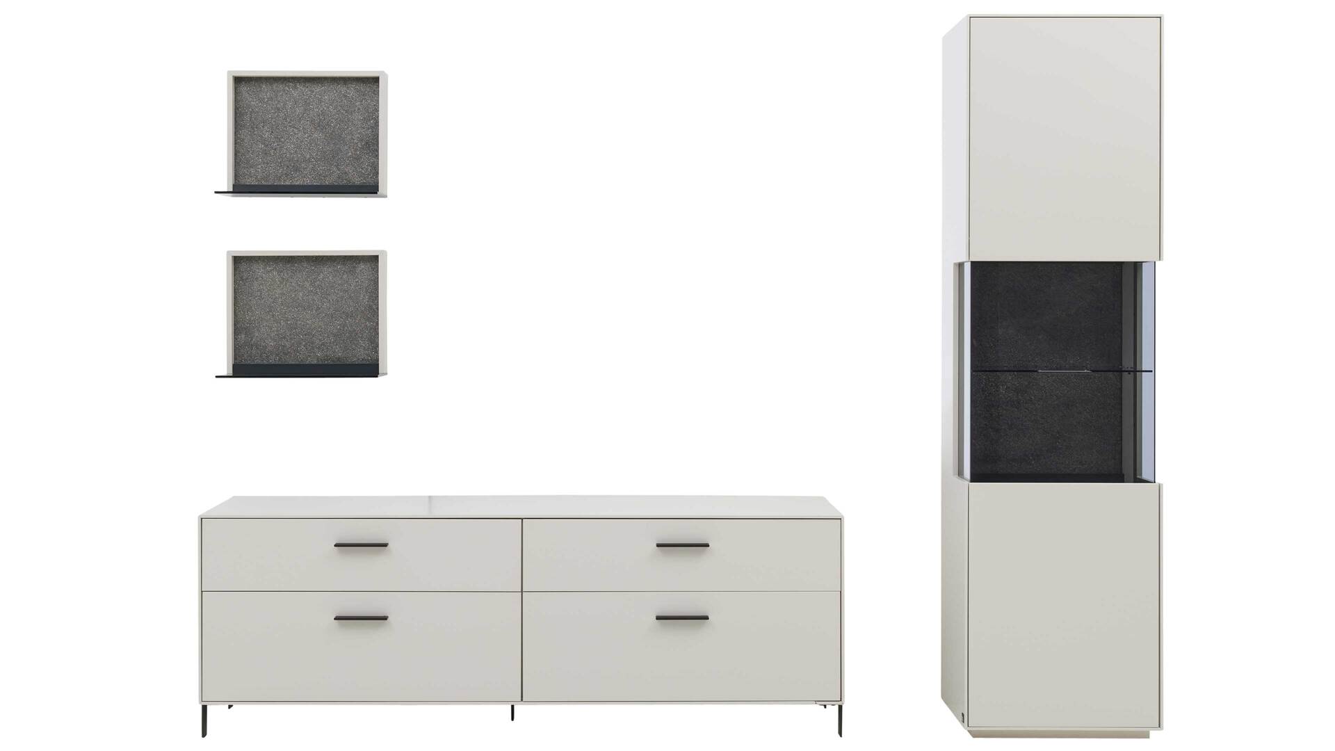 Die Wohnwand 80 aus der Interliving Wohnzimmer Serie 2030 PLUS vereint moderne Eleganz mit funktionalem Design – ideal für stilbewusste Wohnräume mit Persönlichkeit. Mit ihren cremefarbenen Lackoberflächen in Sahara, den edlen Einsätzen aus grauem Parsolglas und den sichtbaren Rückwänden mit Granit-Steinfurnier wirkt sie besonders hochwertig und trendstark. Feinstrukturierte Metall-Details in Schwarz setzen stilvolle Akzente und runden das Gesamtbild harmonisch ab.