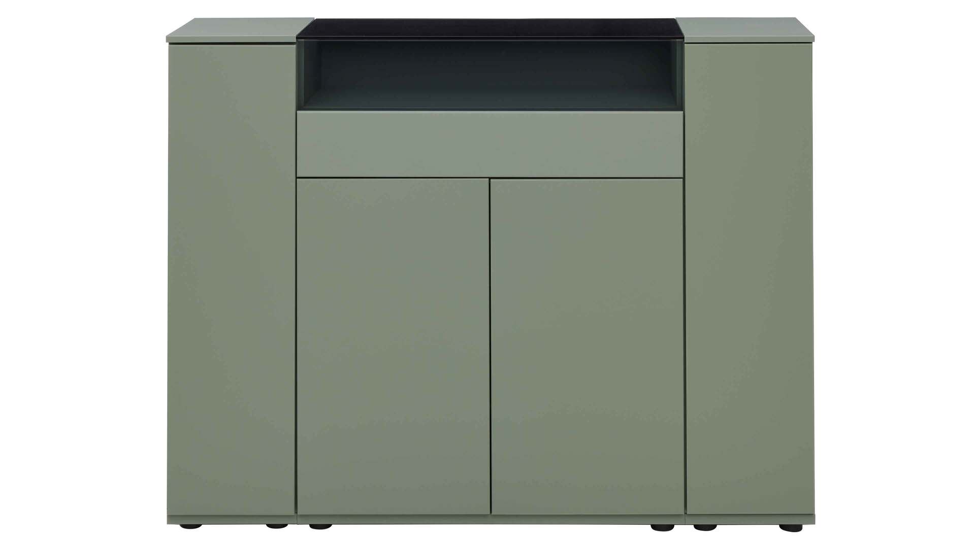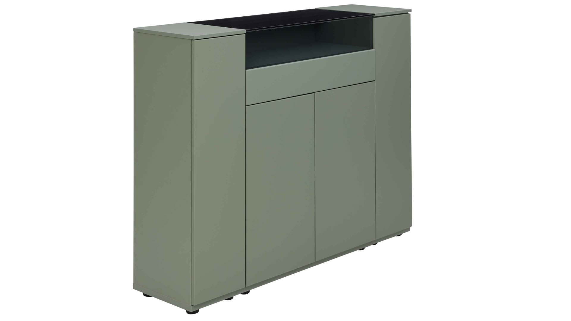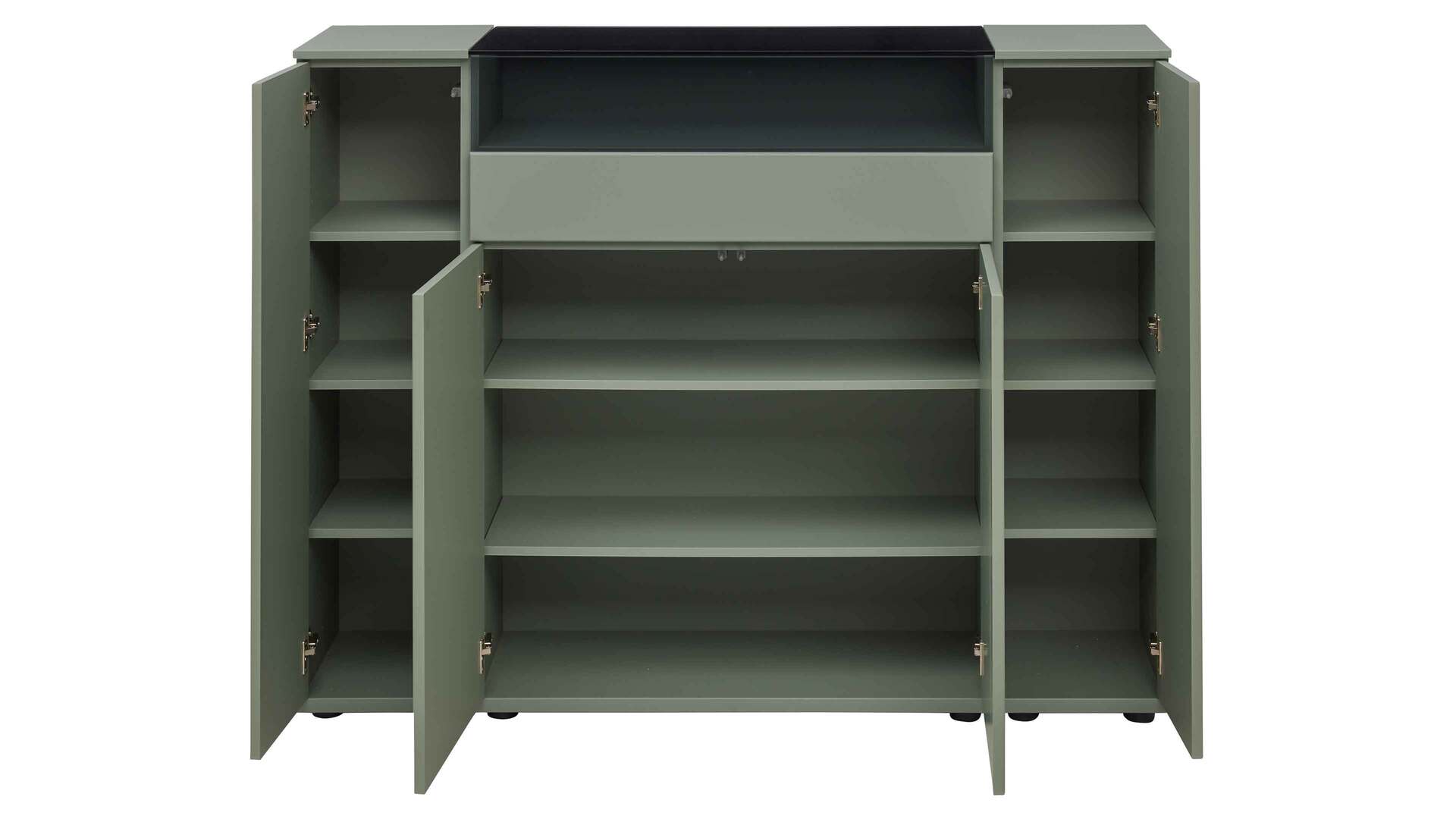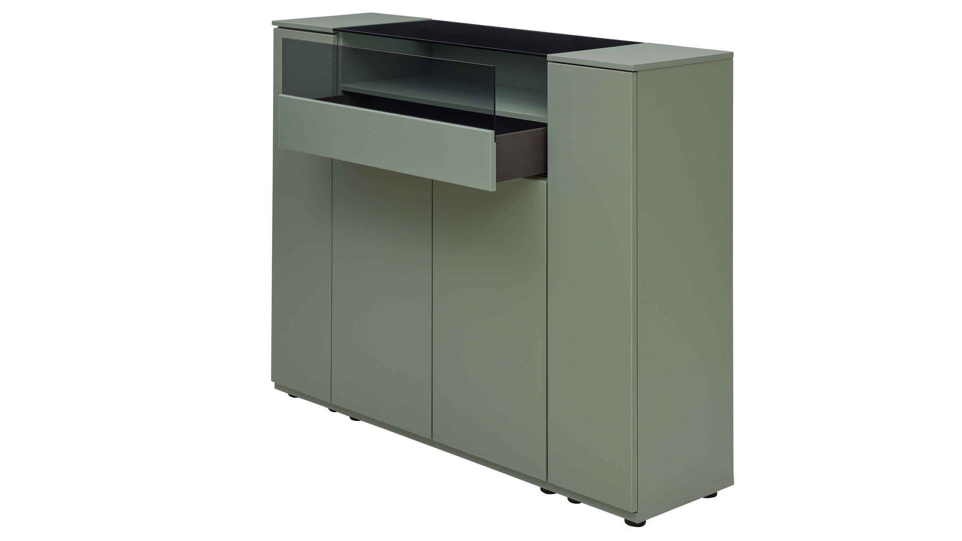 Das Highboard BK15070 aus der Interliving Wohnzimmer Serie 2031 vereint moderne Optik mit funktionaler Raffinesse. Mit seinen matten schilfgrünen Melaminoberflächen und den grau getönten Floatglaselementen setzt es stilvolle Akzente in Ihrem Wohnraum. Die grifflose Frontgestaltung mit Push-to-open Mechanismus sorgt für eine besonders klare Linienführung und ein puristisches Erscheinungsbild.