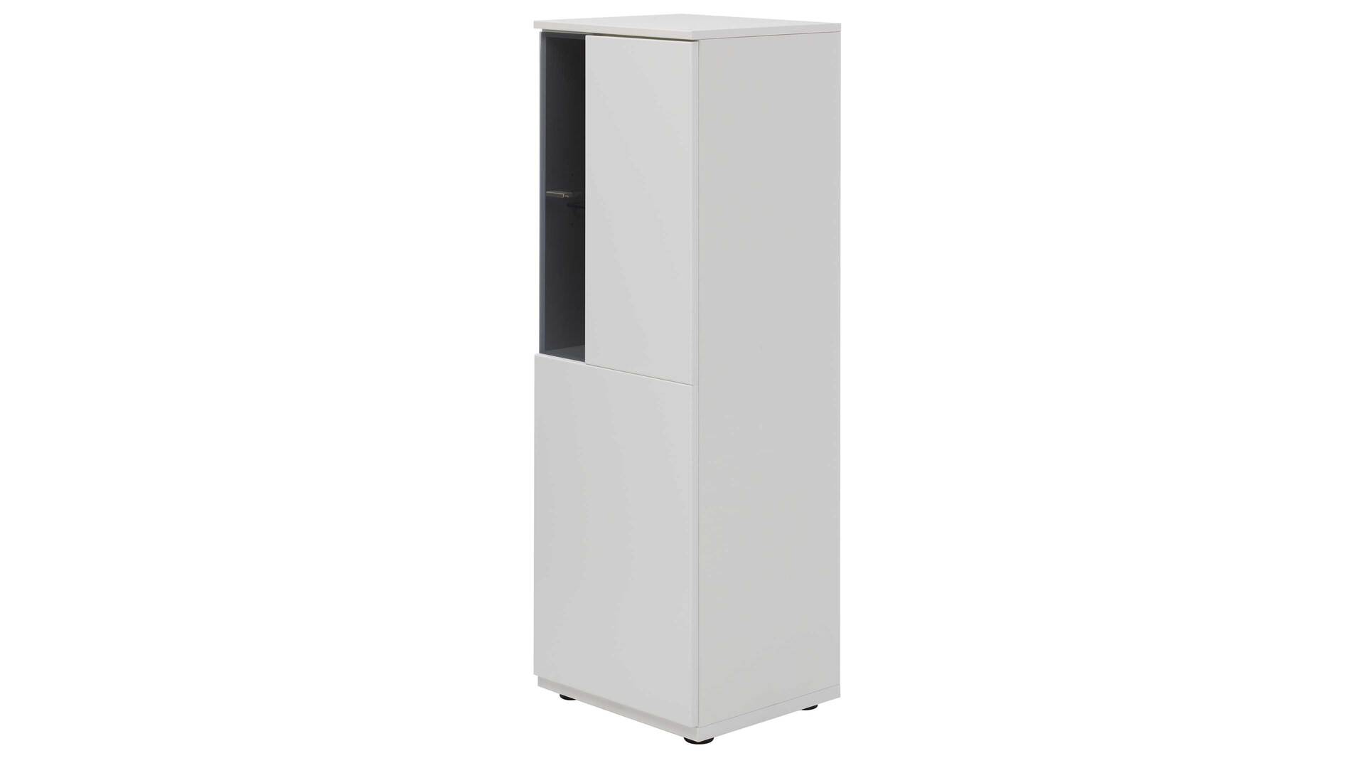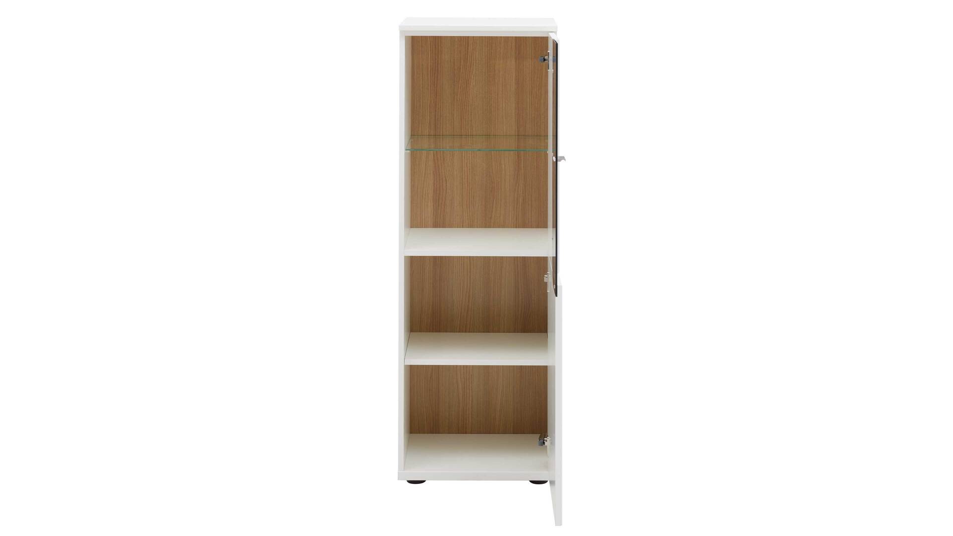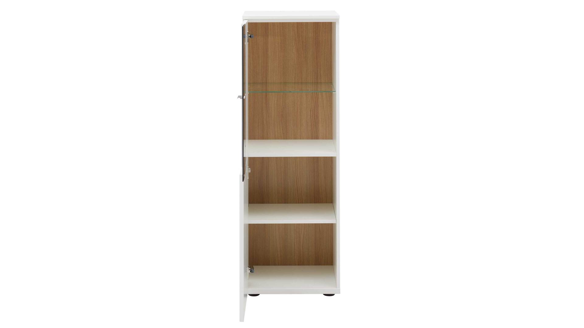 • Highboard B045.152 (links angeschlagen) mit Glaseinsatz in der Tür, einem höhenverstellbaren Glasboden und einem Holzboden, ca. 45 x 131 x 40 cm (BxHxT).