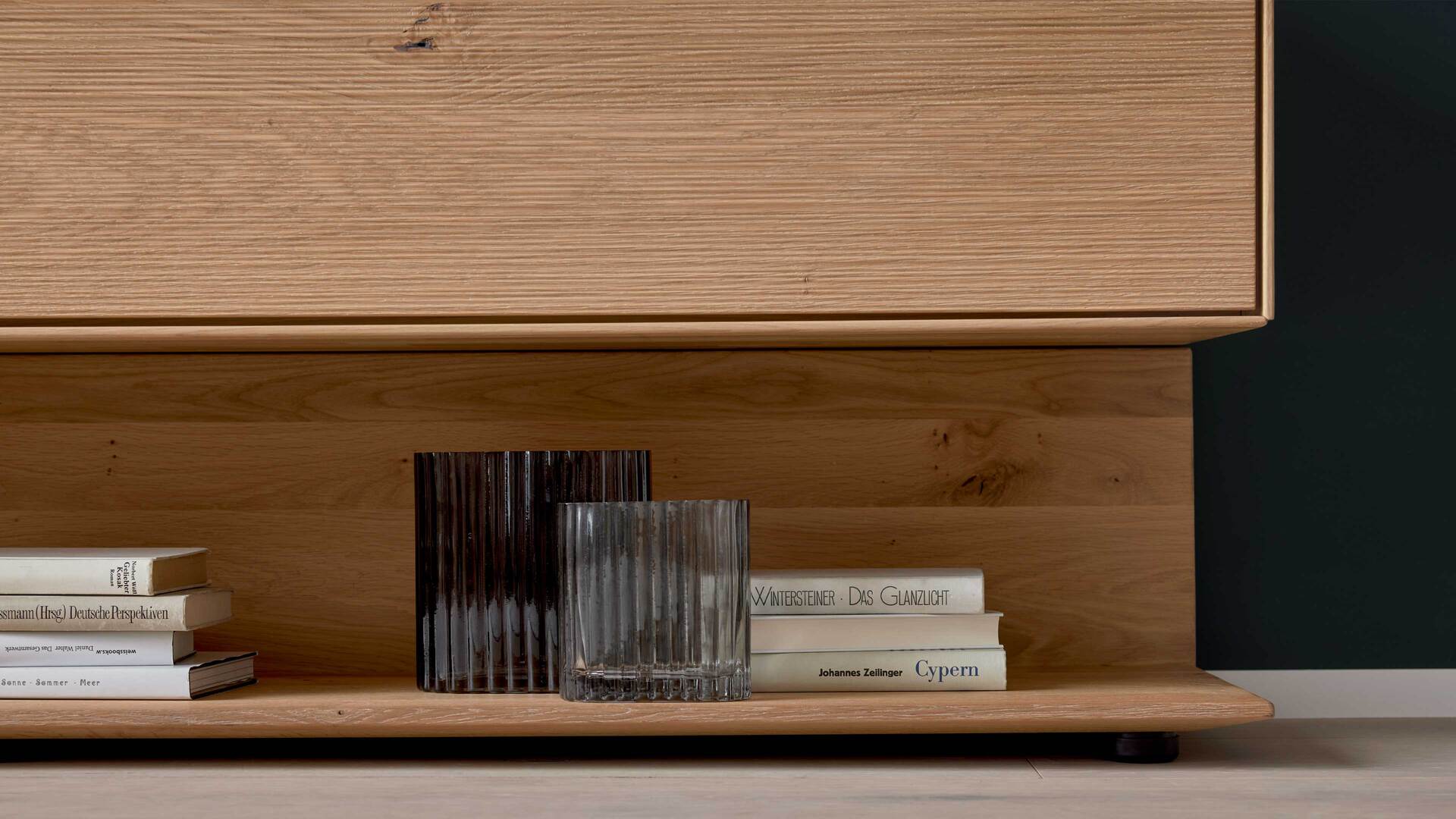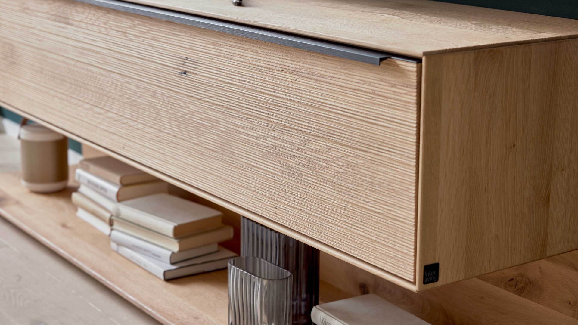 Lowboard 126907 aus der Interliving Wohnzimmer Serie 2033 – ein markantes Massivholzmöbel mit Technik-Komfort