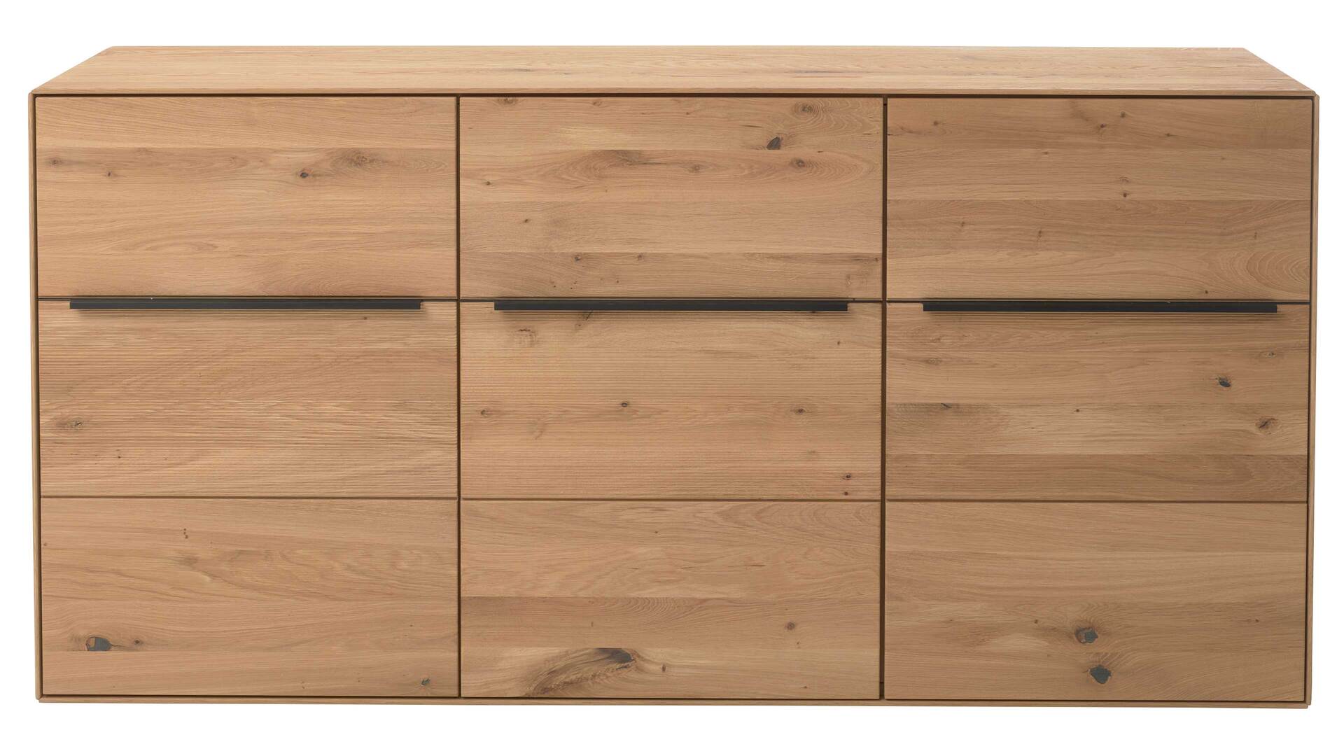 Die drei Türen des Sideboards sind mit Akzentfronten aus gehobelter und gebürsteter Asteiche versehen. Die lebendige Maserung und die fein strukturierte Oberfläche verleihen dem Möbelstück einen authentischen Look und machen es zu einem stilvollen Solitärmöbel für Esszimmer, Wohnzimmer oder Flur. Die filigrane Verarbeitung steht für handwerkliche Qualität und verleiht dem Kommodenschrank seinen einzigartigen Charme.