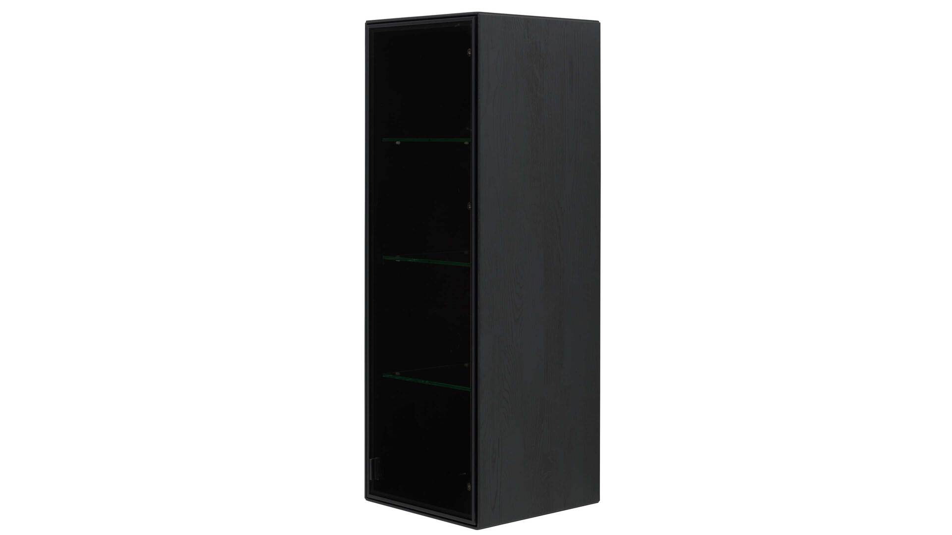 Hängevitrine 126813: Der Korpus in schwarz geölter Asteiche, die biancofarbene Rückwand und die dunkelgraue Parsolglastür bilden ein elegantes Gesamtbild. Drei Glaseinlegeböden bieten Platz für Deine Lieblingsobjekte. Maße ca. 42 x 117 x 40 cm (B/LxHxT)