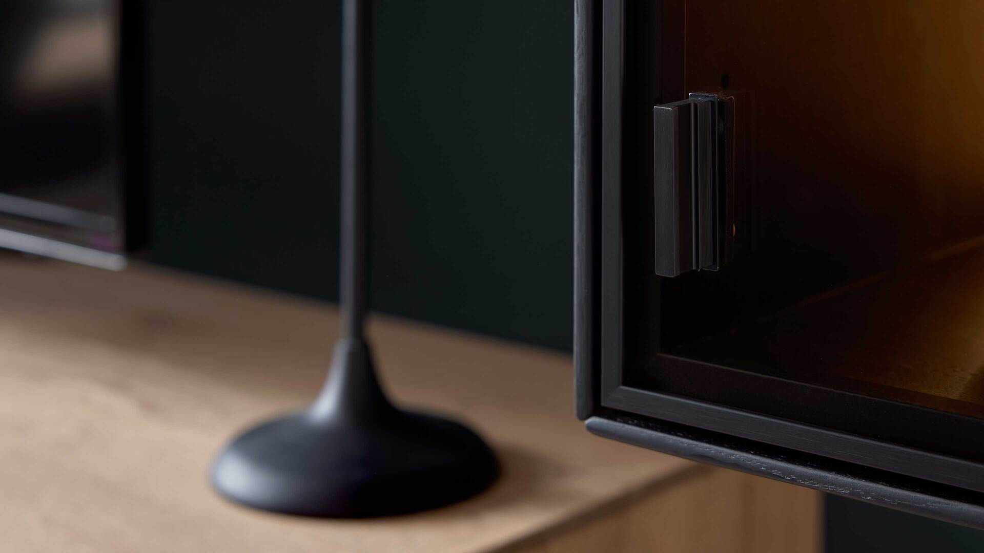 • Edle Kombination aus Schwarz geölter Asteiche, Bianco-Rückwänden und Parsolglas