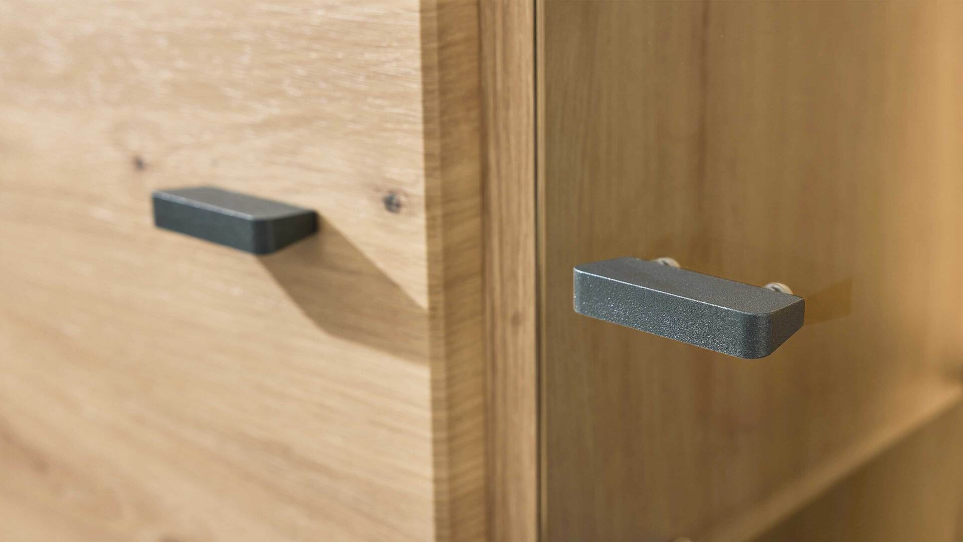 • In edler Alteiche-Nachbildung mit Glas- und Metallakzenten