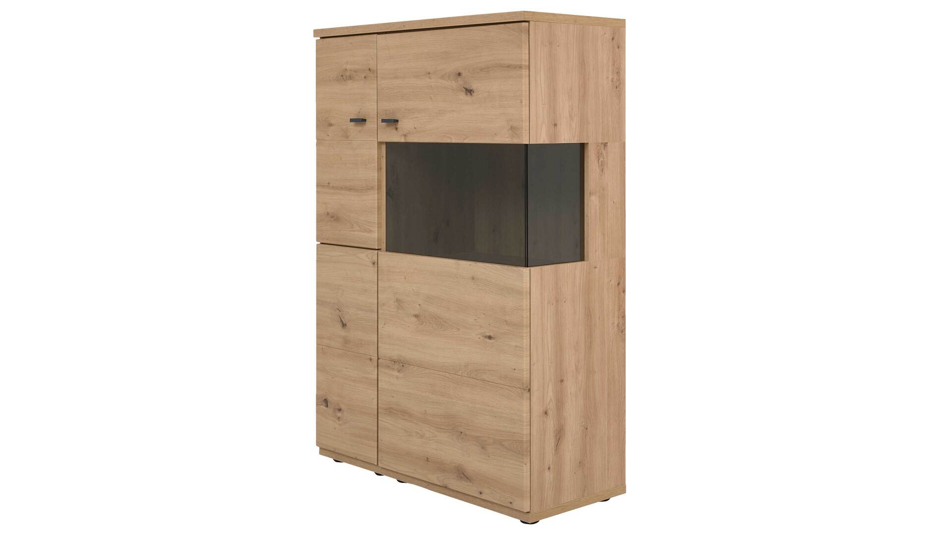 • In edler Alteiche-Nachbildung mit Glas- und Metallakzenten