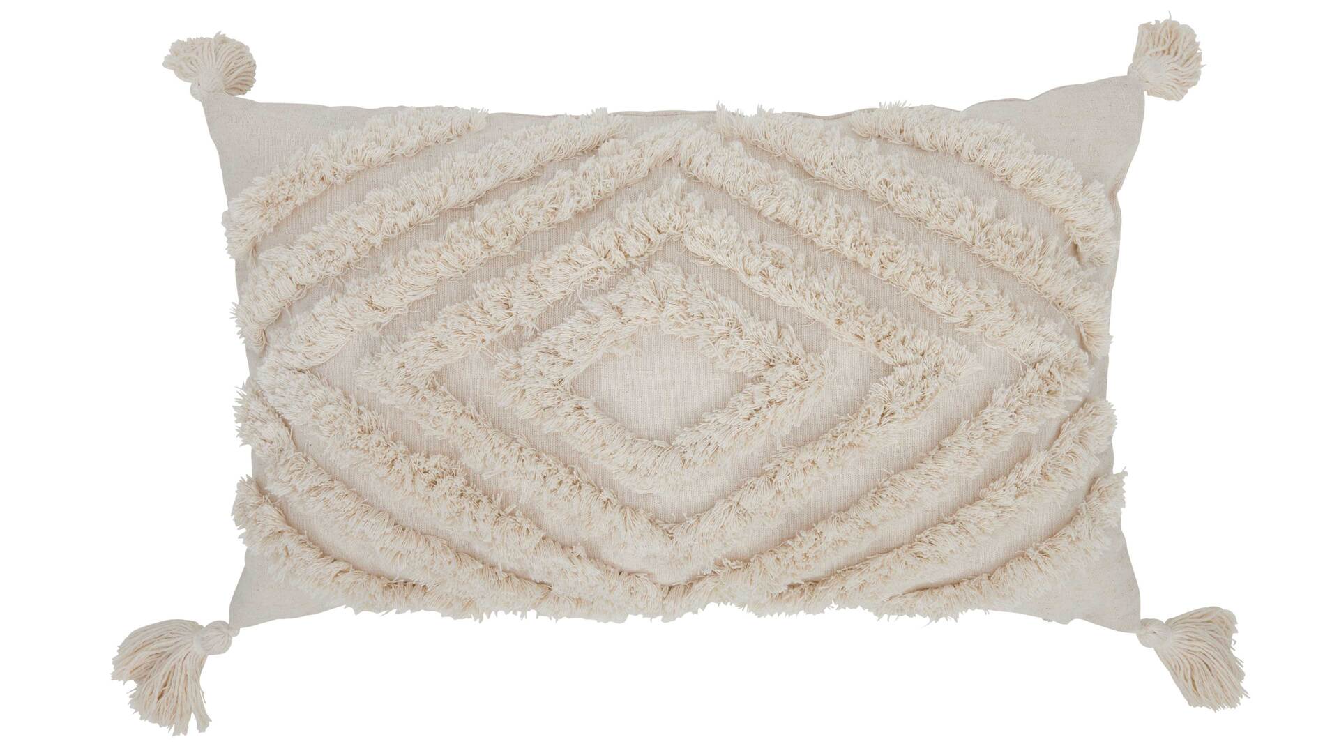 Kissenbezug mit getufteter, erhabender Vorderseite, unifarbener Rückseite und Quasten an jeder Ecke