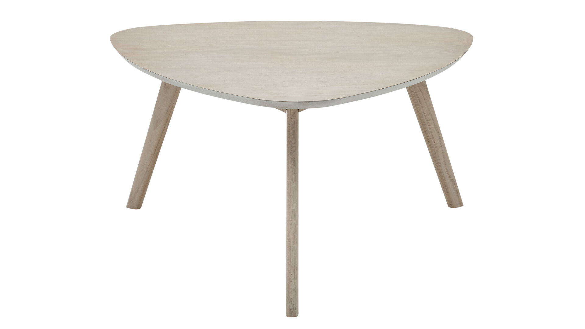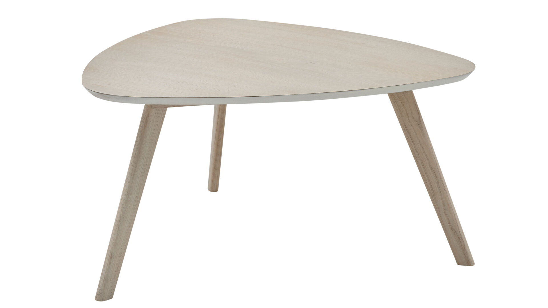 die furnierte Tischplatte wird von drei Massivholzfüßen getragen
